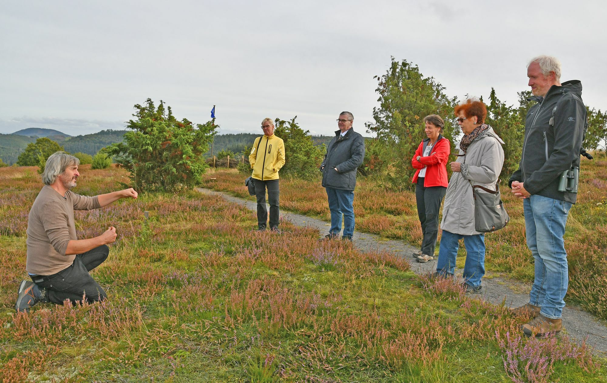 Biologe Jörg Hilgers, der das Naturschutz-Projekt seit Beginn begleitet war ein kompetenter Ansprechpartner. Im Rahmen einer Führung konnte sich die Gruppe von der Landschaft sowie den besonders geschützten Heidelebensräumen, die schon längst verschollen geglaubte Tier- und Pflanzenarten beherbergen, überzeugen. "Der Erfolg der nachhaltigen Entwicklungspflege ist enorm", sagte Hilgers. "Dazu zählt beispielsweise die Wiederansiedlung der Heidelerche, die fast schon ausgestorben war. Heute sind 23 Brutpaare dieser Vogelart in der Heide beheimatet." Zudem hätten zahlreiche bedrohte Vogel- und Insektenarten durch die kontinuierlichen Freistellungs- und Entwicklungsmaßnahmen enorm profitiert und seien wieder zu finden. Besonders stolz ist Dr. Alexander Saftig auf die natürliche Vermehrung des Wacholders. "Zu Beginn des Projektes mussten wir lange suchen, um überhaupt einzelne Exemplare zu finden. Doch heute zeigen sich die Erfolge. Allein in den Naturschutzgebieten Menke-Park und Raßberg zeigen sich über 1.000 Wacholder-Pflanzen." Während die landeseigenen und kommunalen Flächen in den Wacholderheiden vom Land im Rahmen der Biotopbetreuung bearbeitet werden, kümmert sich die Stiftung Natur und Umwelt im Landkreis Mayen-Koblenz um einen Flächenpool von rund 42 Hektar alleine in den Wacholderheiden. Foto: Kreisverwaltung Mayen-Koblenz www.kvmyk.de