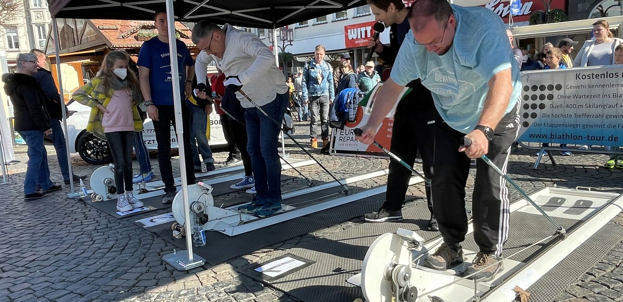 Hier erwartet alle sportlich Interessierte wieder das besondere Event. Eine Staffel besteht aus vier angemeldeten Wettkämpfern/innen. Jeder Teilnehmer legt 400 m (Teilnehmerinnen: 300 m) auf dem Skilanglaufergometer Thoraxtrainer zurück. Etwas außer Atem begegnen sie nun der großen Herausforderung des Biathlons, dem Stehendschießen mit fünf Schüssen aus 10 m auf 50 m-Ziele. Nach dem fünften Schuss werden für jeden Fehlschuss 15 Strafsekunden »abgebrummt«, bevor die Übergabe an den Staffelkollegen erfolgt. Geschossen wird mit Original Biathlongewehren, die zu Lichtgewehren umgebaut wurden. Die Wettkampfdauer beträgt pro Teilnehmer rund drei bis vier Minuten (pro Staffel rund 15 Minuten). Jede Staffel wird per E-Mail darüber informiert, in welchem Rennen sie ist. Die Staffeln müssen spätestens um 13.45 Uhr vollständig anwesend sein. Wer ein cooles gemeinsames Outfit, einen Einlaufbanner und sogar einen einschüchternden Schlachtruf präsentiert, hat beste Chancen auf den Sonderpreis für die kreativste Staffel. Die Siegerehrung der Biathleten ist am Samstag, 16.40 Uhr, geplant. Die besten Teams erhalten Ehrenpreise.