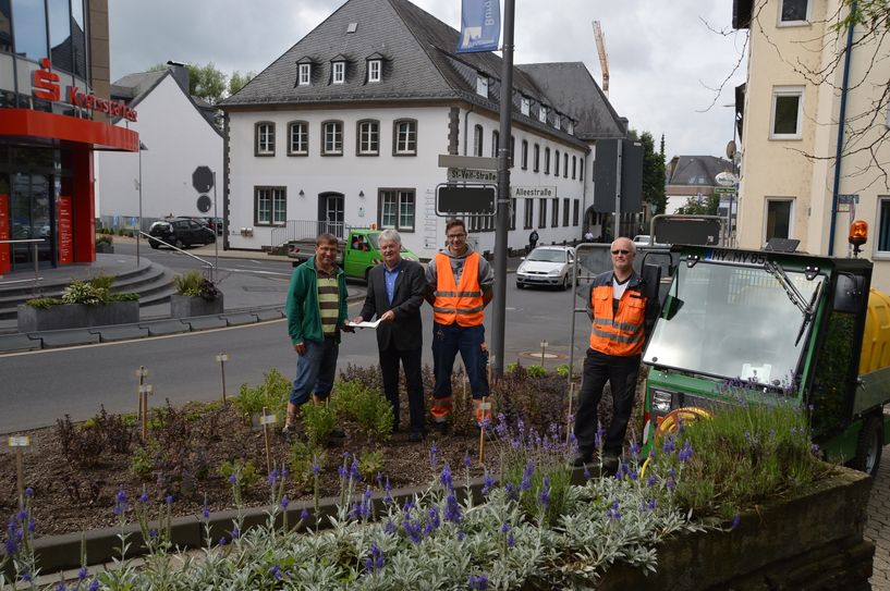 Sedum telephium - auch "Fette Henne" genannt – sind zum Beispiel eine gute Nahrung für Wild - und Honigbienen, erläuterte Gärtnermeister Wolfgang Seul (links). Er freut sich gemeinsam mit Bürgermeister Rolf Schumacher (2. v. l.)), dass das Projekt "Mayen Stadt der Bienen" nun neben dem Fachzentrum Bienen und Imkerei auch von der Lehr- und Versuchsanstalt für Gartenbau in Heidelberg begleitet wird. Foto: Jacqueline Blang/Stadt Mayen www.mayen.de