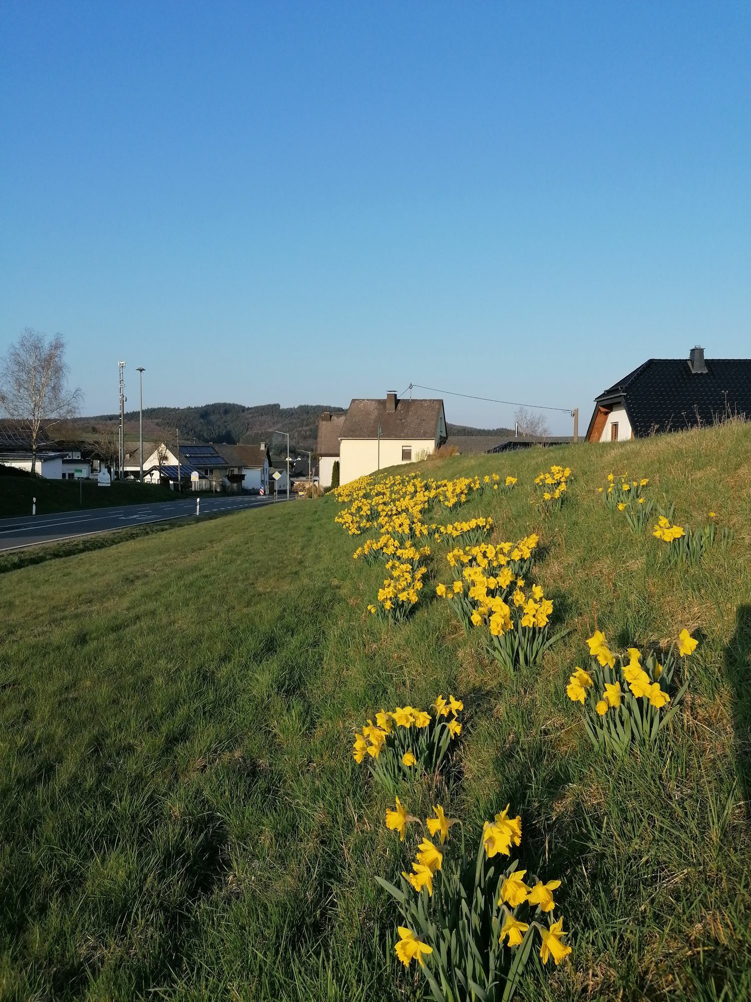 Die vor zwei Jahren von der Dorfgemeinschaft und einigen Freiwilligen angelegte Narzissen-Wiese sind farbige Frühlingsboten. Rund 150 Meter lang ist der gelb blühende Teppich, der am Wall zur Bundesstraße angelegt wurde und damit auch ein Willkommensgruß im ersten Ort - vom Nürburgring kommend - der Verbandsgemeinde Vordereifel. Foto: privat