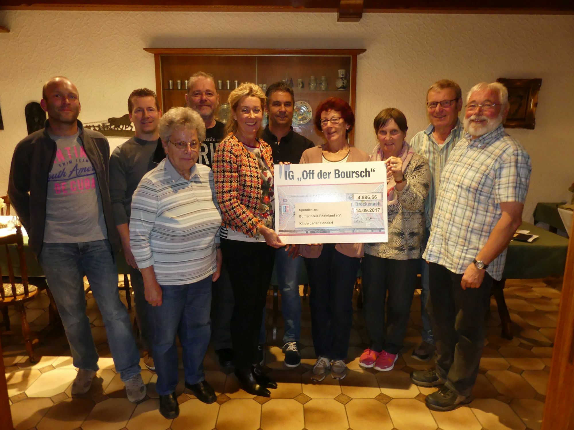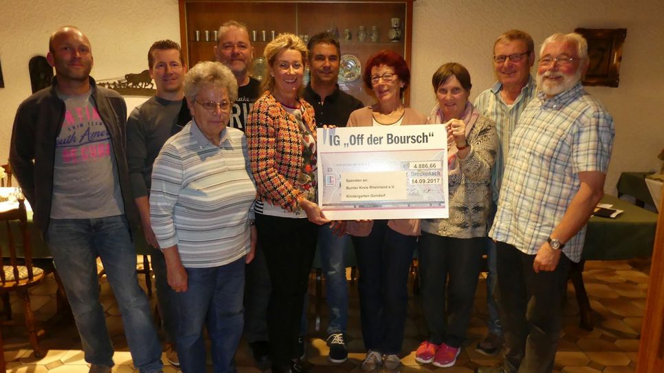Für die Unterstützung der Clown-Doktoren wurde vorab ein Betrag von 300 Euro überwiesen. Jeweils 2293,33 Euro erhielten der Kindergarten Gondorf zur Erweiterung des Fuhrparks für die Kinder und der Bunte Kreis e.V. zur Finanzierung einer Erlebnis-Freizeit für Geschwisterkinder. Die Interessengemeinschaft "Off der Boursch" ist stolz, bisher insgesamt mehr als 120.000 Euro an die verschiedensten Organisationen gespendet zu haben. Und natürlich – es geht weiter. Am 22. Juli 2018 wird das 37. Bourschfest veranstaltet. Foto: privat