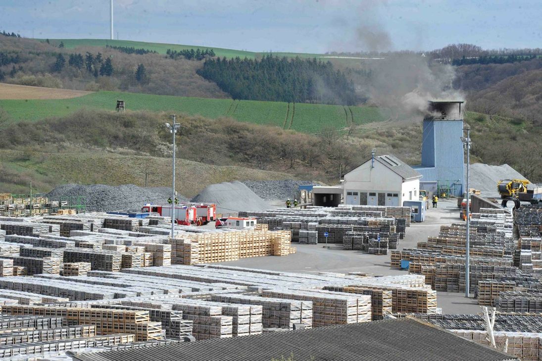 Schwarze Rauchschwaden steigen aus dem Förderturm des Schieferproduzenten auf dem Katzenberg. Nach Angaben eines Firmensprechers ist ein Radlader unter Tage in Brand geraten. Alle Mitarbeiter konnten sich in Sicherheit bringen. Die Brandursache ist unklar. Der Radlader soll jetzt kontrolliert abbrennen. Foto: Walz