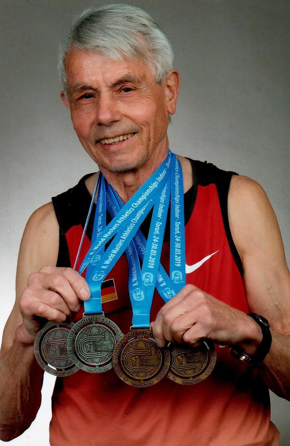 Erstmals in der Altersklasse M80 startend, überraschte Adolf Nehren seine zehn Mitkonkurrenten aus Ungarn, den USA, Indien, Tschechien, Finnland und Deutschland zunächst mit einer konstant guten Serie im Weitsprung und dem einzigen Sprung in der Konkurrenz in den Viermeter-Bereich. Mit 25 Zentimetern Vorsprung und einer Weite von exakt 4,00 Metern errang der Monrealer die Goldmedaille und damit den Weltmeistertitel seiner Altersklasse. Noch überraschender war seine Silbermedaille im 60-Meter-Sprint - mit acht hundertstel Sekunden hinter dem US-Amerikaner Bob Lida, der die Konkurrenz in 9,30 Sekunden gewann. Im 200 Meter-Finale konnte Nehren seinen Medaillensatz um eine Bronzemedaille ergänzen. Mit den Sprinterfolgen war der TuSser für die 4x200 Meter-Staffel gesetzt. In der Besetzung Linke, Klaus, Nehren und Müller gewann das deutsche Quartett in 2:23,11 Minuten vor den USA (2:25,56 min) und Polen. Fotos: privat www.latus-mayen.de
