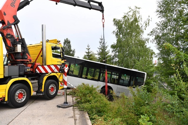 Der Bus rollte rückwärts vom Parkplatz eine Böschung hinunter gegen einen Zaun. Vermutlich war, so die Vermutung der Polizei, das Fahrzeug nicht ausreichend gegen Wegrollen gesichert. Am Bus entstand ein nicht unerheblicher Sachschaden. Foto: Walz