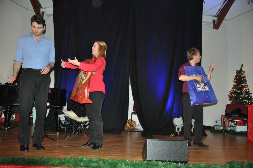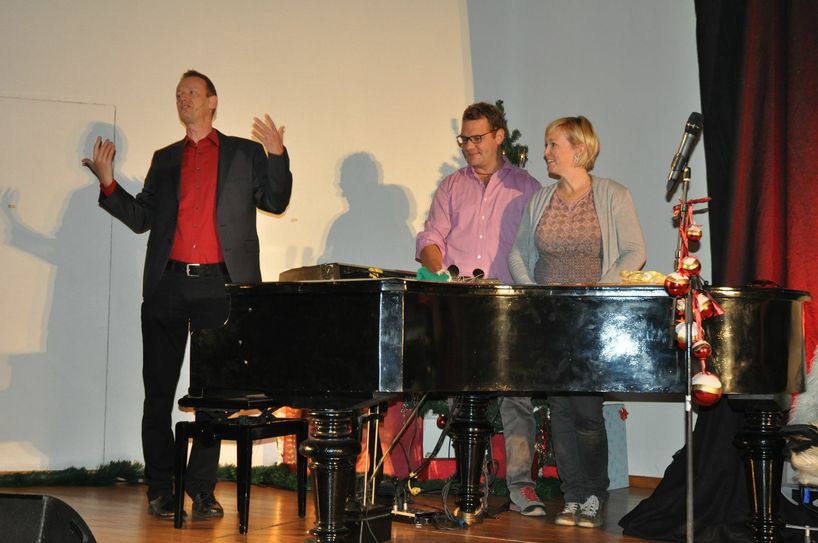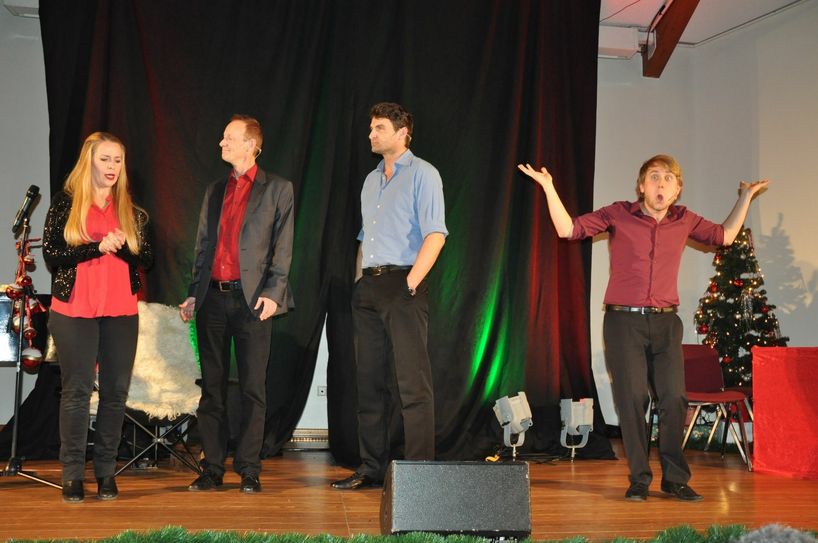 Das Ensemble des Bonner Improvisationstheaters hatte, angelehnt an die Gaben der drei Weisen aus dem Morgenland, jede Menge gute Laune, kreative Ideen und Spontaneität im Gepäck. Das bewiesen Paul Hombach, Norbert Frieling, Sandra Sprünken und Marvin Meinhold quer durch alle Genres und Klischees rund ums Weihnachtsfest. Olivia und Peter aus Mertloch ließen beispielsweise einen Blick in ihren Heilig Abend-Ablauf zu, der mit ein wenig Daumenakrobatik die Schauspieler zu schnellem Handeln herausforderte. Das galt auch für eine Impro mit Gebärdendolmetscher rund um den »Brauch« Sauerkraut im Garten zu verstreuen. Gags und Mimik zündeten Lachsalve auf Lachsalve. Und dann waren da noch die unvermeidbaren Gedanken über die Dörfer der Region - in diesem Jahr über Roes und Thür. Fotos: Pauly www.vg-mayen.de