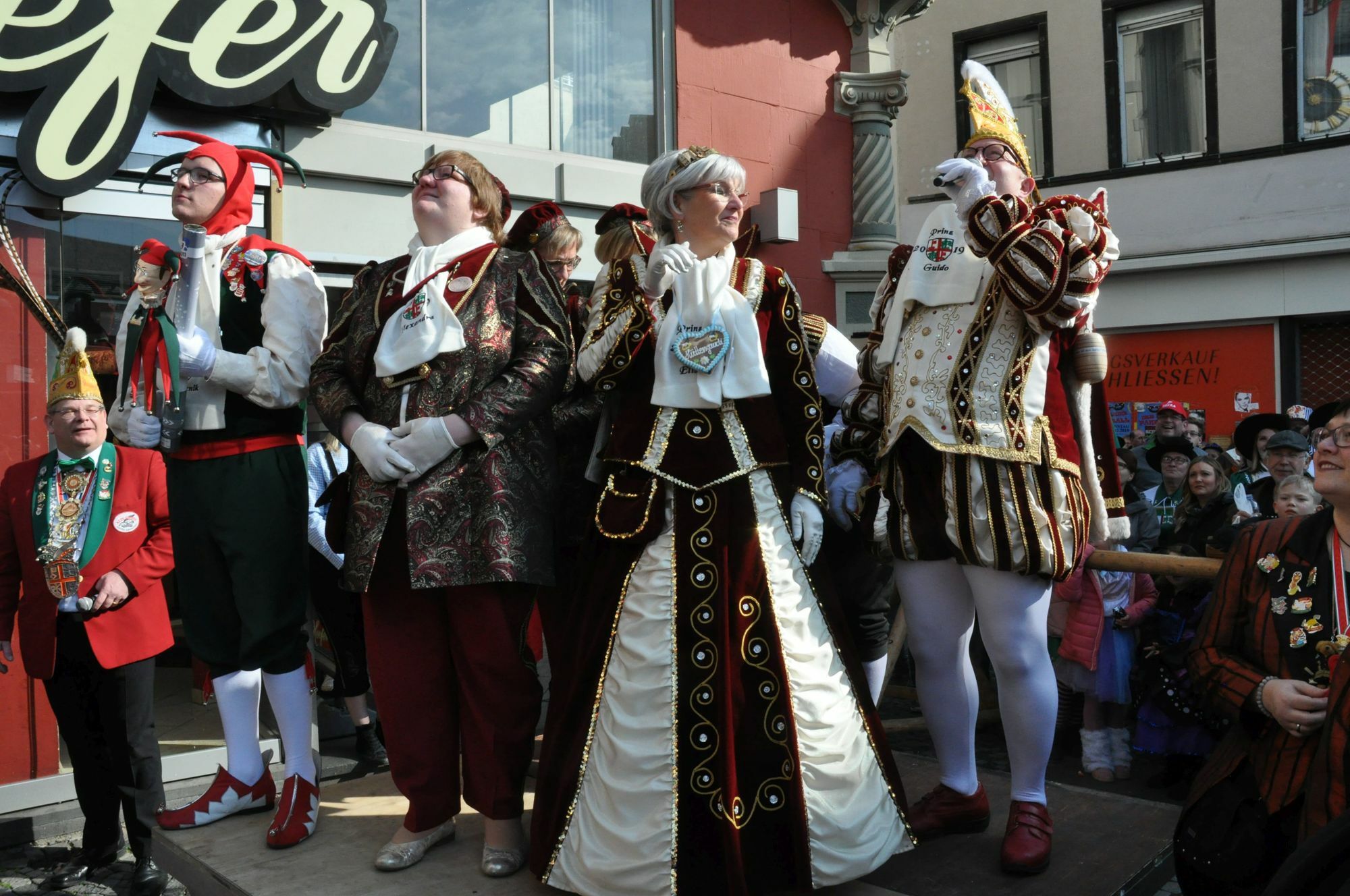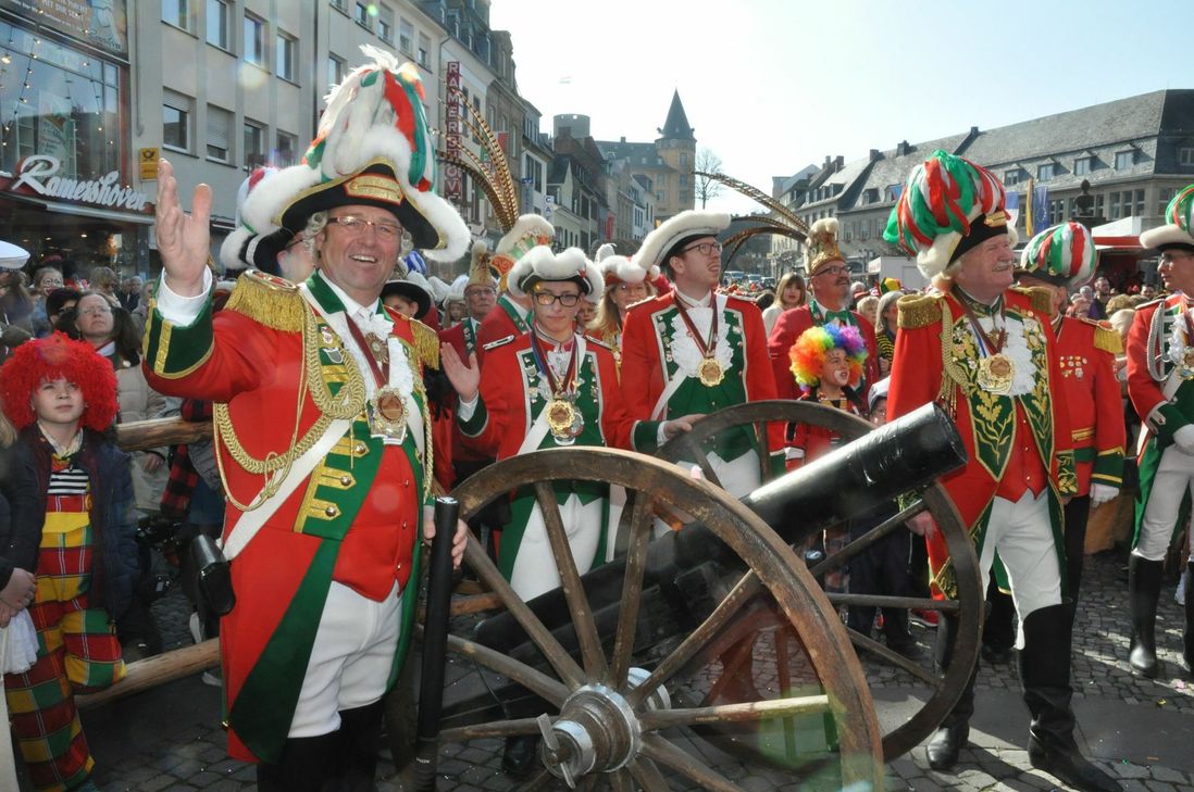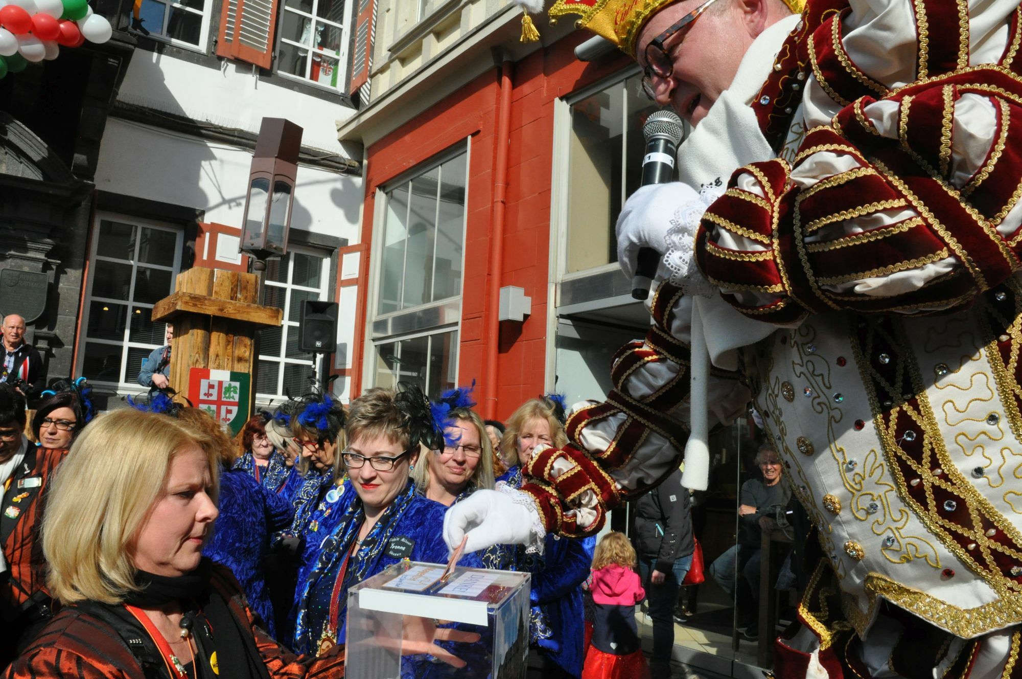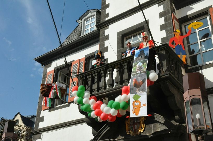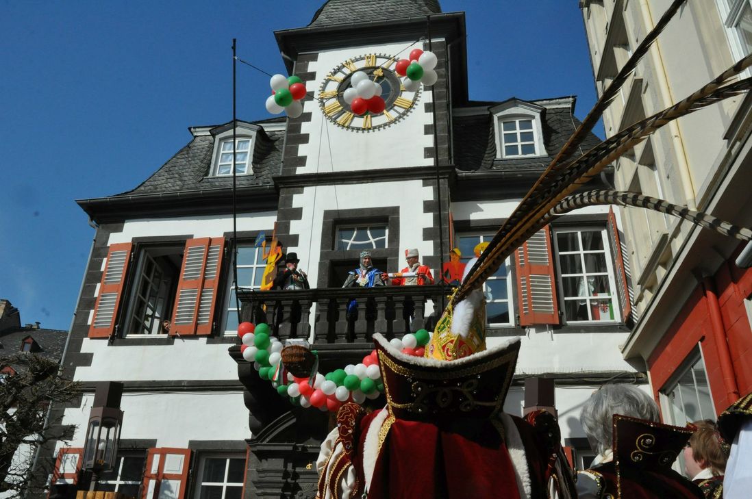 Die Unterstützung für das Mayener Prinzenpaar war riesig. Zusammen mit seinem Gefolge, den karnevalistischen Korporationen der Stadt und nicht zuletzt der Möhnen-Power gelang es den Tollitäten Oberbürgermeister Wolfgang Treis und seine Helfershelfer in die Knie zu zwingen. Der hatte zwar bei der Krönung des Prinzenpaars listig einen freien Einzug ins Rathaus versprochen, aber letztlich bedurfte es des Geschicks von Guido und Elisabeth, die ein Bilderrätsel lösen mussten und den Marktplatz mit Rucki-Zucki in Bewegung setzten. Darüber hinaus zeichnete eine Spendensammlung für die Kinderstation des Mayener Krankenhauses großen Erfolg, denn die geforderten 111,11 Euro waren ziemlich schnell erreicht. Zudem öffnete die Beigeordnete Martina Luig-Kaspari mit dem Lied vom Mayener Mädche die Türen, die von der Konfettikanone der Prinzengarde sturmreif geschossen wurde. Letztlich waren es die Holzwurm-Möhnen, die den finalen Ausschlag gaben. Jetzt liegt die Stadt bis zum Aschermittwoch in Narrenhand... Fotos: Pauly