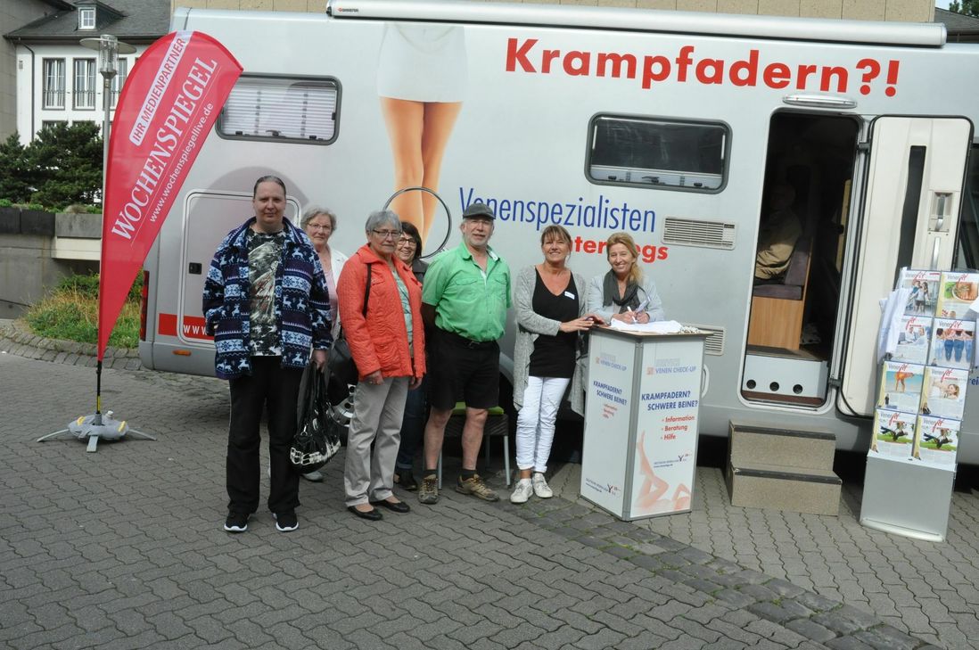 Fast jeder bekommt im Laufe seines Lebens mit den Venen zu tun. Je älter die Betroffenen sind, umso häufiger zeigen sich typische Symptome der erkrankten Venen: Krampfadern, geschwollene und müde Beine. Die Ursachen sind vielfältig: Langes Sitzen belastet das Venensystem. Das Blut versackt in den Beinen, Besenreiser oder Krampfadern entstehen. Kombiniert mit Übergewicht und Bewegungsmangel ist das gesunde Venensystem komplett überlastet. Gerade an heißen Sommertagen können häufige Beschwerden ein Hinweis auf eine schlechte Funktion der Venenklappen sein. Venenleiden sind eine ernst zu nehmende Erkrankung. Wer Probleme hat, sollte einen Venenspezialisten aufsuchen und fachlich qualifizierte Beratungsangebote annehmen. Da man aber häufig lange auf einen Termin wartet, haben der WochenSpiegel und die Deutsche Venenliga e.V. genau das Richtige: das "Venen-Mobil". Kostenlos und ohne Termin können Sie sich hier untersuchen lassen. Die Untersuchung dauert rund zehn Minuten. Jeder Teilnehmer erhält einen Venenpass und ausführliches Informationsmaterial zum Thema "Venenleiden". Bis 17 Uhr warten die Phlebologie-Assistentinnen Wilma Pauli und Nicole Schug auf Ihren Besuch. Weitere Info unter: www.venenliga.de, telefonisch unter: 0 26 74 / 14 48 oder per E-Mail an: info@venenliga.de Fotos: Pauly