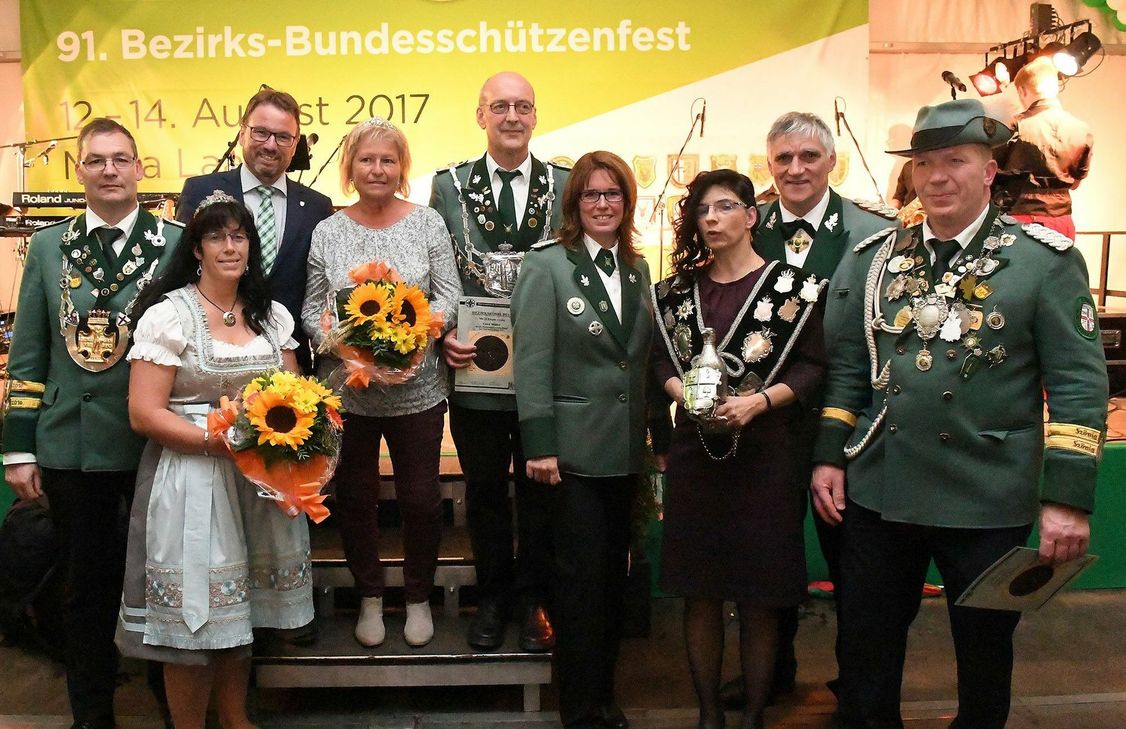 Dem neuen Bezirkskönigspaar Lydia und Gerd Müller (4. und 5. von links) gratulierten (von links) das Diözesankönigspaar Nicole und Stefan Tullius von der St. Hubertus Schützenbruderschaft Kaisersesch, der Mayener Oberbürgermeister und Schirmherr des Bundesfestes, Wolfgang Treis, die Brudermeisterin der Nitztaler Schützen, Kerstin Müller, die Zweitplatzierte Petra Zimmer, der Bezirksbundesmeister Norbert Steffens, und der Drittplatzierte Andreas Scheler.  Foto: Walz