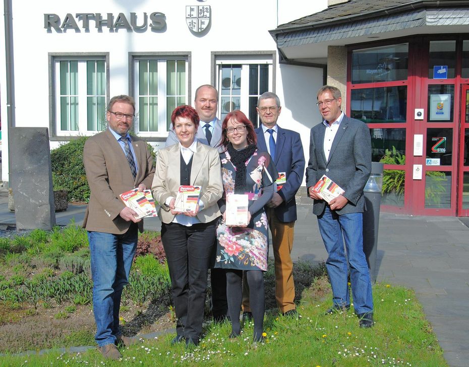 Mayens Oberbürgermeister Wolfgang Treis konnte die Selbstlernbücher - im Wert von 500 Euro - aus den Händen von Jörg-Dieter Fischer, Oberstleutnant beim Zentrum Operative Kommunikation und Präsident des Rotary Club Mayen sowie dessen Schatzmeister Heinz Seemann entgegen nehmen. Die Selbstlernbücher mit Übungs-CD gehören zum rotarischen Leseförderprojekt "Lesen lernen - Leben lernen". Es soll Flüchtlingen in Deutschland schnell Sprachkompetenz vermitteln und ist zum Selbststudium geeignet. Oberbürgermeister Treis bedankte sich für die Spende des Rotary Club Mayen: "Für die Integration ist die Sprache ein zentraler Baustein, umso mehr ist es wichtig, die Flüchtlinge von Anfang an beim Erlernen der Sprache zu unterstützen. Ich bin froh und dankbar über das soziale Engagement, dass der Rotary Club seit Jahren in der Stadt Mayen leistet." Die Selbstlernbücher mit Übungs-CD sollen in der VHS zum Einsatz und Verteilung kommen. Foto: Sabine Neiß/Stadt Mayen www.mayen.de