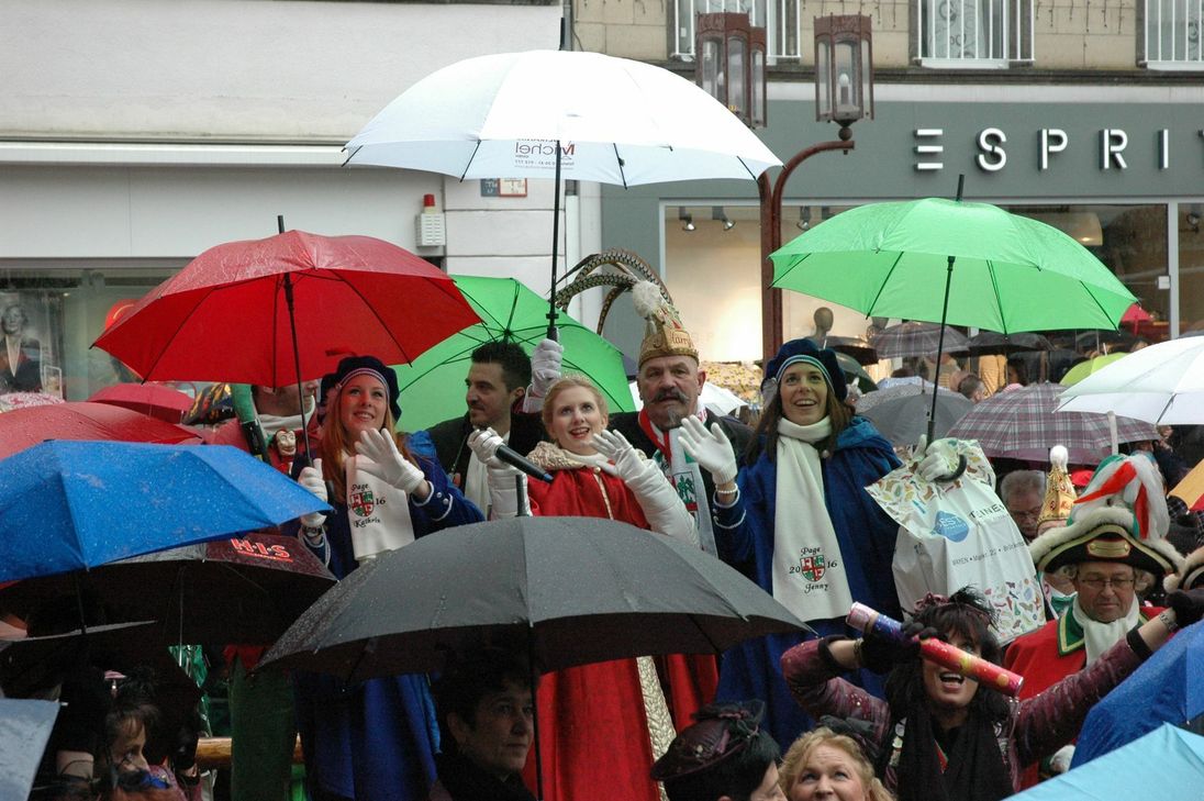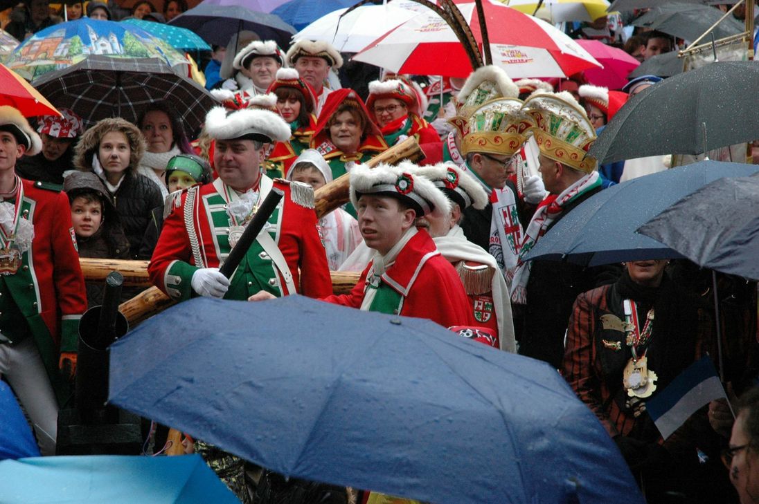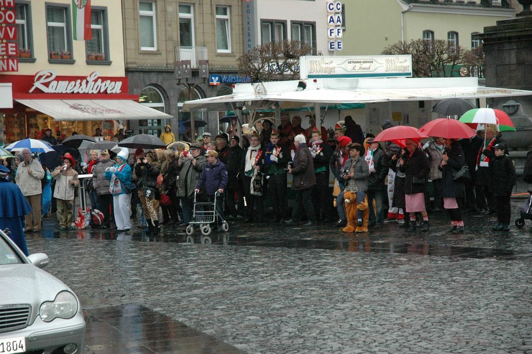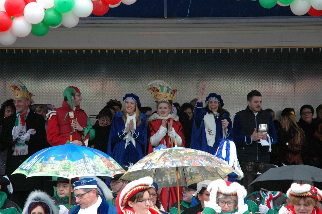 Trotz des ungemütlichen Wetters zog es viele Jecken auf den Mayener Marktplatz, um an der Erstürmung des Rathauses teilzunehmen. Pünktlich um 11.11 Uhr startete die Party auf dem Marktplatz. Nachdem die Prinzessin die „Narren“ begrüßt hatte, besuchte sie noch Sparkassenfiliale am Markt. Um 12.45 Uhr begann dann der Sturm auf das alte Rathaus. Im strömenden Regen gelang es der Prinzessin mit ihrem Gefolge unter lauten „Mayoh“- Rufen das Rathaus zu erstürmen und den sich den Schlüssel zur Stadt zu sichern. Fotos: Wollenweber
