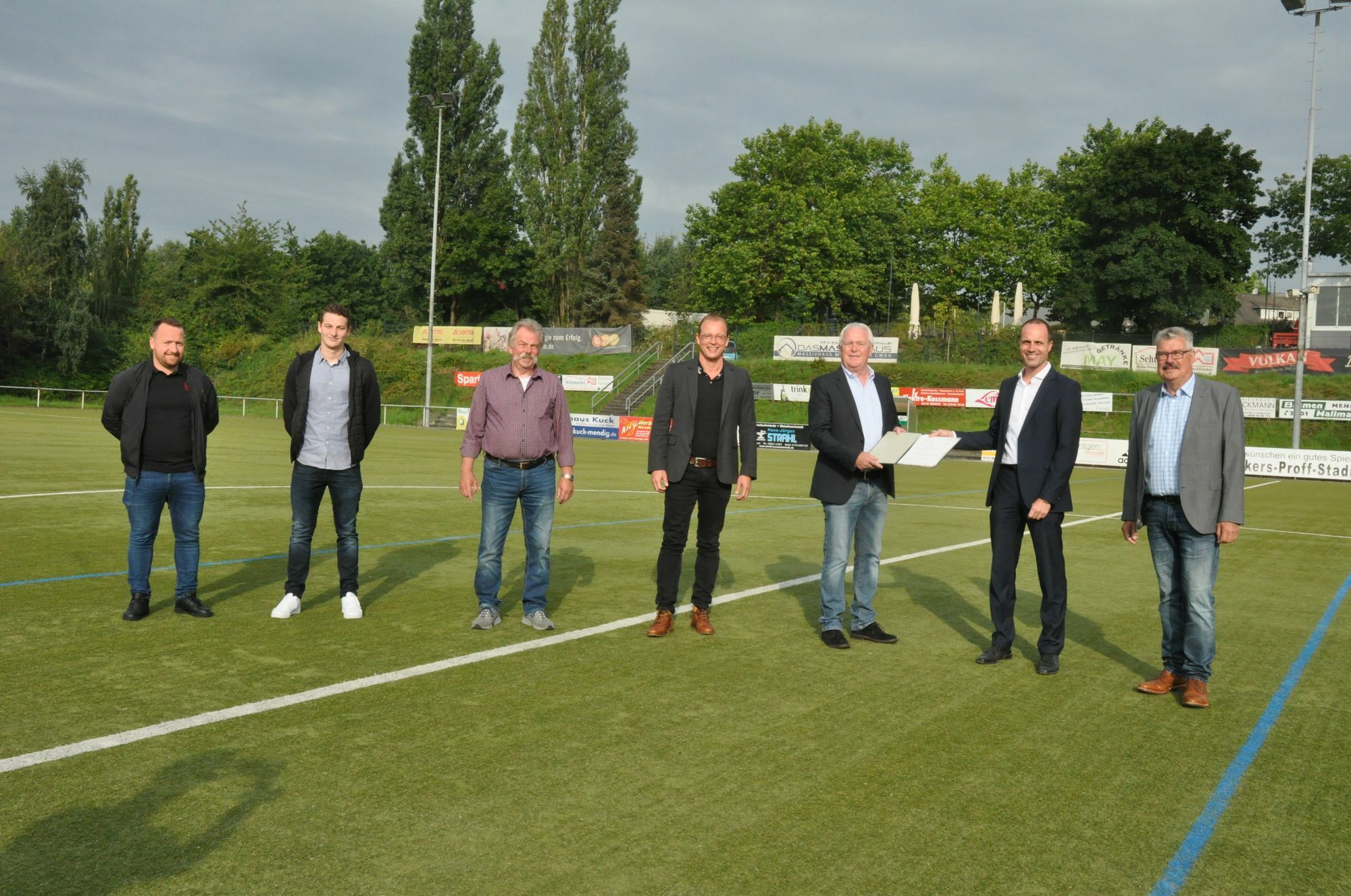 Bernd Krayer, Vorsitzender des SV Eintracht Mendig, ist der Stolz anzusehen. Der erst 2009 gebaute Kunst-rasenplatz wies im Sommer 2016 – kurz nach der Gewährleistungspflicht – erste Schäden auf. Das im Kunstrasen eingebrachte Granulat verklumpte bei großer Hitze und setzte sich an den Schuhen der Sportler fest. Der Platz musste deshalb aus Sicherheitsgründen mehrfach gesperrt werden. "Nach jahrelangem Bemühen wurde die Sanierung schließlich im September 2020 vom Kreissportausschuss in der Prioritätenliste zur Sportanlagenförderung auf Platz 1 gesetzt. Damit stand der umfangreichen Antragsstellung nichts mehr im Wege", blickte Bernd Krayer noch einmal zurück. Bei der Sanierung des Kunstrasenplatzes, inklusive eines Kunstrasenpflegegerätes, sowie der Umrüstung der Flutlichtanlage auf LED-Technik dreht es sich, laut dem von Krayer aufgestellten Finanzierungsplan, um eine Investitionssumme von 398.000 Euro (Land: 99.900 Euro; Mayen-Koblenz: 37.064 Euro; VG Mendig: 25.000 Euro; Förderprogramm LED: 15.618 Euro; Verein: 30.000 Euro; Stadt Mendig: 191.000 Euro). Den Zuwendungsbescheid des Landes überbrachte jetzt Staatsminister Clemens Hoch in Vertretung von Sportminister Roger Lewentz. "Es ist einer der meistbespielten Plätze im nördlichen Rheinland-Pfalz", betonte Hoch und hob auch noch einmal das finanzielle Engagement der Stadt und der VG Mendig hervor. Mit der Übergabe des Zuwendungsbescheids können jetzt die Arbeiten ausgeschrieben werden. "Wir müssen jetzt eigentlich nur noch einen geeigneten Termin für die Baumaßnahme finden", sagt Stefan Berresheim von der beauftragten Ingenieurgesellschaft "Dr. Siekmann und Partner". Und danach kann der Fußball in Mendig wieder problemlos rollen. Fotos: Pauly/privat