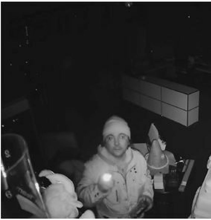 - Täter 1: männlich, augenscheinlich zwischen 20 und 30 Jahren alt, nackenlange, gelockte Haare, 3-Tage-Bart, dunkel gekleidet, schwarze Hose, Jacke mit Kapuze, Wollmütze, Taschenlampe, Handschuhe