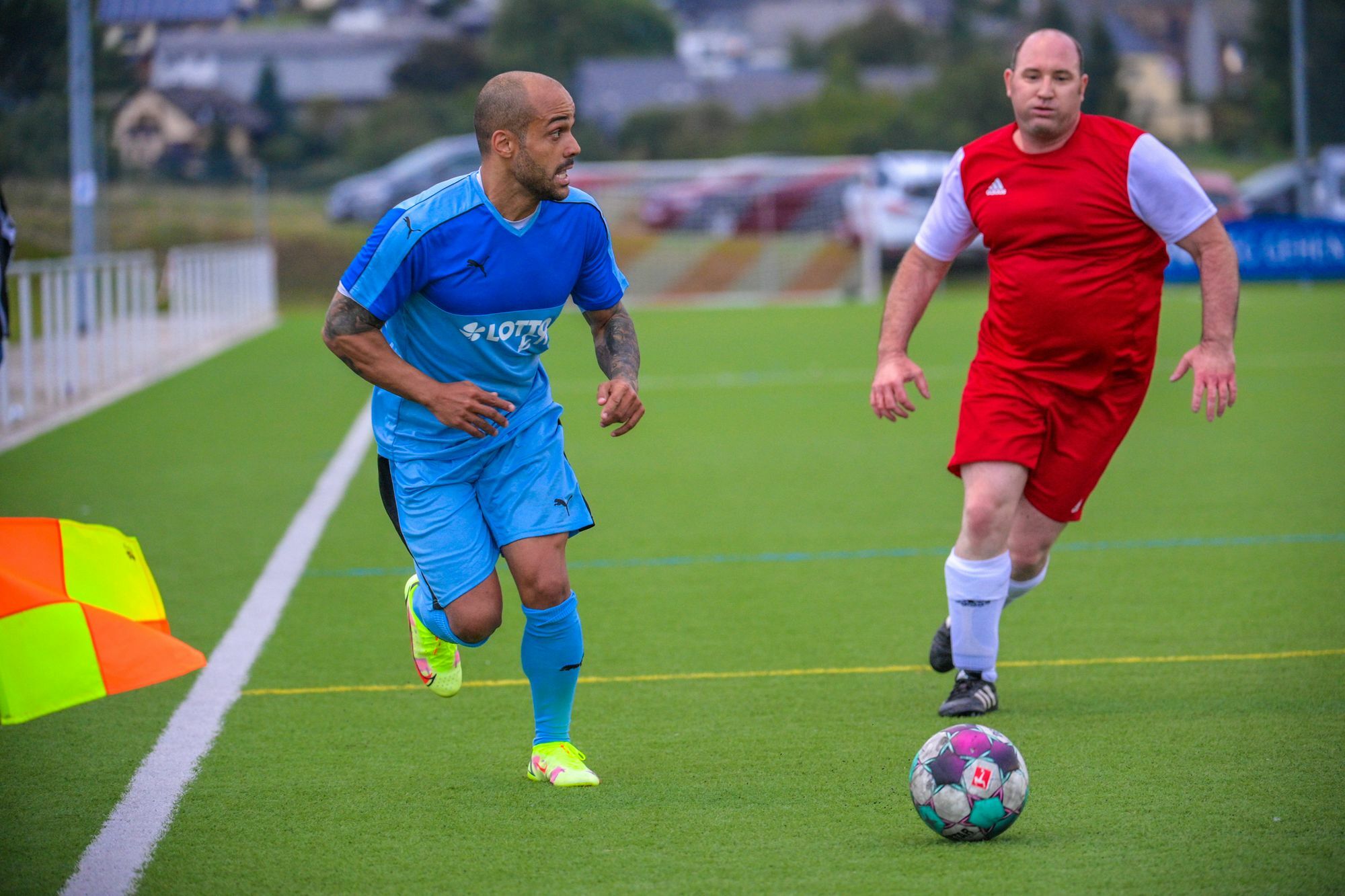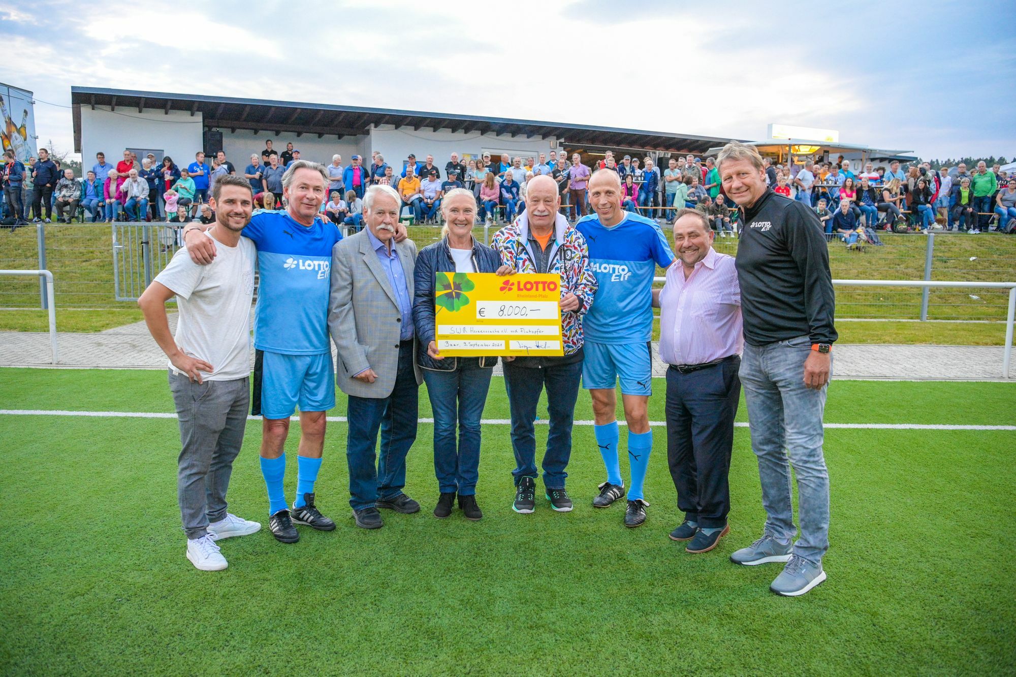 Als Schiedsrichter Alexander Müller das Spiel der Lotto-Elf gegen eine AH-Auswahl aus der VG Vordereifel abpfiff, brandete Applaus der rund 400 Zuschauer in Wanderath auf, denn die hatten nicht nur ein 14:0 (7:0) der Prominentenmannschaft von Lotto Rheinland-Pfalz gesehen, sondern auch dazu beigetragen, dass ein Spendenscheck in Höhe von 8.000 Euro an die SWR-Herzenssache übergeben werden konnte. Sportlich ist die Geschichte des Spiels schnell erzählt. Das Team von Fußball-Europameister Hans-Peter Briegel ließ den wackeren AH-Kickern keine Chance – alleine der Ex-Kölner Matthias Scherz traf sechs Mal – und versäumte es sogar einen noch höheren Sieg einzufahren. Das dies nicht gelang, lag sowohl an den guten Torhüterleistungen von Torsten Thelen und Andreas Karmann sowie einer insgesamt noch recht stabilen Defensive. "Wir wollten nicht die Mannschaft sein, die die höchste Niederlage gegen die Lotto-Elf eingesteckt hat. Das ist uns gelungen", schmunzelte Andreas Pung von der Auswahl nach der Partie. Die Spendensumme soll jetzt Kindern an der Ahr zugute kommen. Damit sollen sowohl kurzfristige als auch mittel- und langfristige Hilfen gegeben werden. "Das ist eine ganz tolle Spendensumme. Damit haben wir nicht rechnen können", freute sich Christian Hänzgen, Vorsitzender der ausrichtenden DJK Baar, die vom Schirmherren Alfred Schomisch, Bürgermeister VG Vordereifel, animiert wurde das Spiel für den guten Zweck zu organisieren, um helfen zu können. Helfen ist auch das Stichwort für die Stiftung des Fußballverbandes Rheinland, die bereits Hilfen für die Kinder an der Ahr in die Wege geleitet hat, wie es Walter Desch, Präsident des Fußballverbandes betonte, der die DJK Baar für sein großes Engagement lobte. Der Verein legte in punkto Helfen auch noch nach, denn der Erlös von Getränken und Speisen fließt der Stiftung des Fußballkreises "Fußballer helfen Fußballern" zu. "In solchen Notlagen ist es einfach wichtig, dass die Menschen zusammenstehen", brachte es der 1990er Weltmeister Guido Buchwald, dem wegen einer Verletzung in Wanderath nur die Zuschauerrolle blieb, in einem Satz auf den Punkt. Fotos: Seydel www.lotto-rlp.de