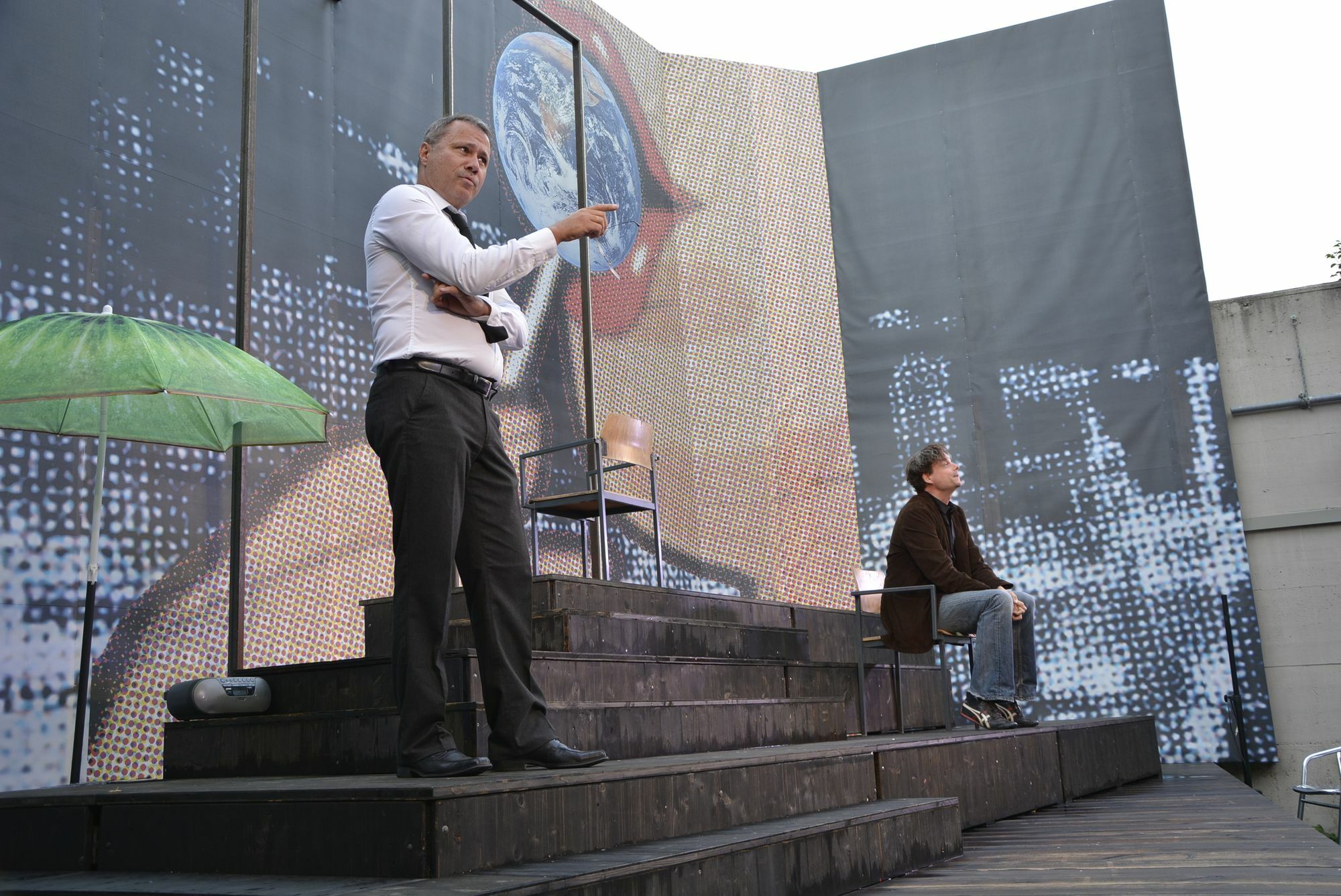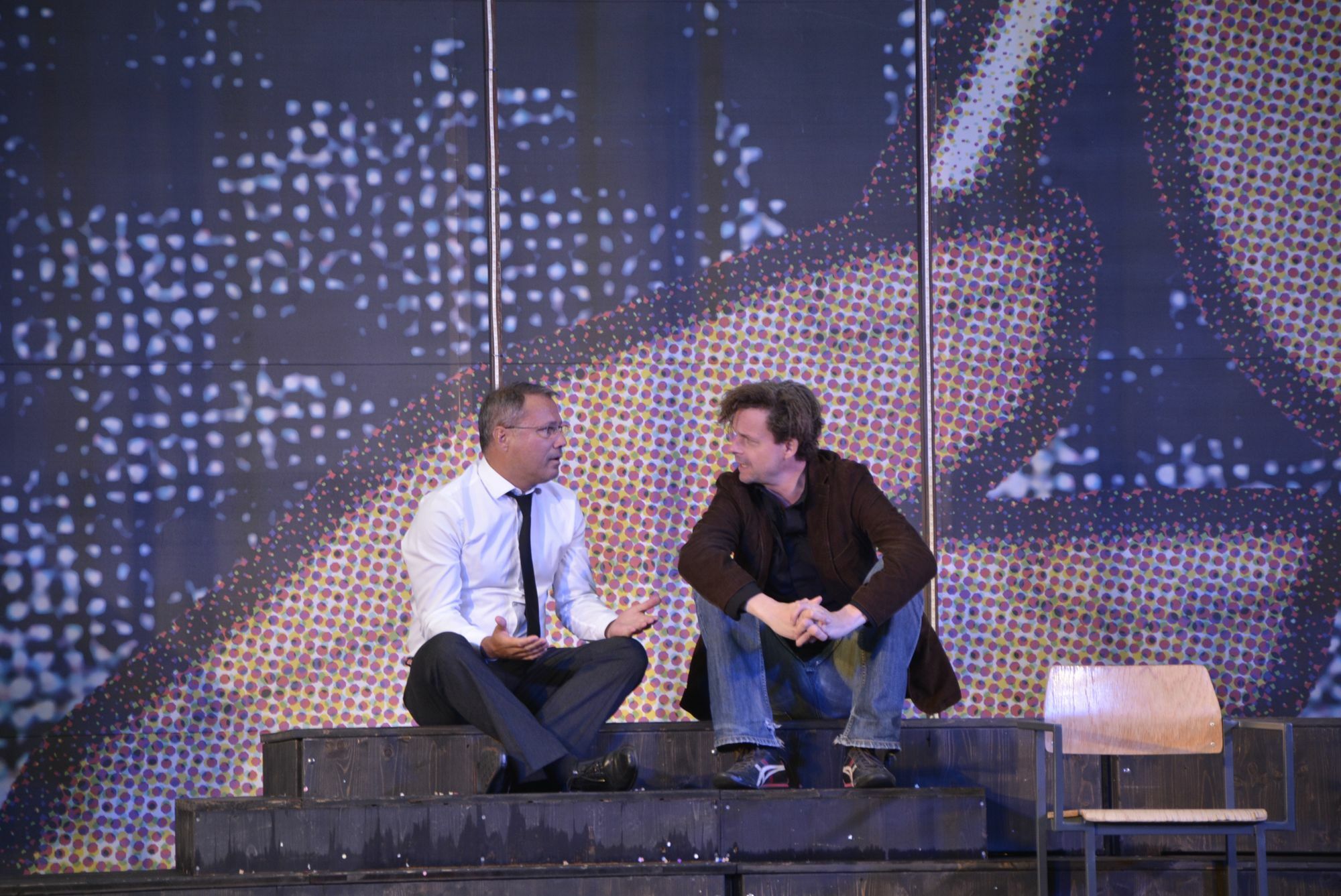 Im Festpiel-EXTRA »Einer von uns« auf der Kleinen Bühne stand Daniel Ris sein Freund und Schauspielkollege Christian Banzhaf zur Seite. Die beiden hatten für die deutsche Erstaufführung des kanadischen Stückes von Daniel MacIvor die Dramaturgie selbst entwickelt. Dabei flossen aktuelle politische Geschehnisse wie die Protestbewegung »Fridays for Future« mit ein. Die beiden Akteure lieferten mit Leidenschaft ein tragisch-komisches Stück ab, das die Zuschauer forderte. Man konnte sich nicht einfach zurücklehnen, sondern Aufmerksamkeit war gefragt. Dies fiel dem geübten Theatergänger sichtlich leichter als dem Gelegenheitsbesucher. Nichtsdestotrotz war es spannend zu erleben, wie sich die beiden Männer im Lauf des Stückes im Dialog annäherten und nach Beziehungsproblemen ein tragisches Ende fanden. Das Bühnenbild kommt mit wenigen Utensilien aus: zwei Stühle und eine Cordjacke. Mittendrin die beiden Männer, die in zehn verschiedene Rollen schlüpfen, die in einer gewissen Beziehung stehen. Für die Zuschauer entwickelt sich ein Puzzle, das sie sich in ihrer eigenen Empfindung zusammen setzen können. Auf jeden Fall bleibt von der ersten bis zur letzten Minute - von der schicksalhaften Mitteilung der unheilbaren Krankheit des Ray bis zum tänzerischen Schlussakkord - die Spannung erhalten. Fazit: »Einer von uns« ist ein Stück, das erfrischend anders ist und das das Prädikat »besonders wertvoll« verdient hätte. Wer neugierig geworden ist, kann das Zweipersonenstück noch am Freitag und Samstag, 9. und 10. August, genießen. Daniel Ris nach den ersten beiden Aufführungstagen: »Wir waren zufrieden. Am Freitag waren die Zuschauer von Anfang an dabei und genossen den Humor. Am Samstag jedoch war das Publikum zögerlicher«, beschreibt Ris die unterschiedlichen Reaktionen. Fotos: Kruft