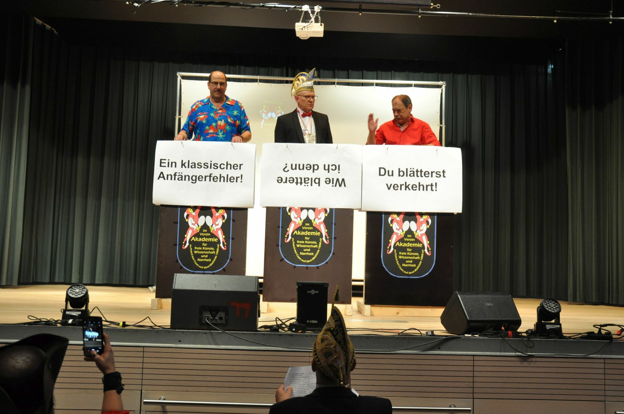 Alleine schon der Vereinsname verlangt eine wissenschaftlich-akademische Auseinandersetzung: "Akademie für freie Künste, Wissenschaft und Narrheit zu Polch bei Caan auf dem Maifelde". Dem Verein gehören unter anderem Mitglieder aus drei Weisheitsstufen an. Dies sind der Professor, die Candidaten und die Studiosen, die, wie es in der Satzung von 1888 festgeschrieben ist, den regelmäßigen Bescheinungen des jungen Mondlichts beiwohnen. Karnevalistischer Studiengang Vor rund 30 Jahren entdeckte Willi Wagner diesen Passus und beschloss den karnevalistischen Studiengang neu zu beleben. Dafür bedurfte es natürlich auch Studierenden, die sich ihre närrischen Sporen zunächst als Studiosen verdienen müssen. Der Geist des Karnevals wird ihnen von Professor Hans-Georg Ziesemer und von Kanzler Willi Wagner eingeimpft. Zudem hat Werner Dieler bereits die nächste Stufe, die des Candidaten, erreicht. Zehn Aufrechte sind im Studiosen-Level und der Elfte kam jetzt hinzu. Frank Breitbach, ein Mann mit karnevalistischer Vergangenheit, der einst Kinder-Kanzler und Vorstandsmitglied im Verein Akademie war. Der "Bierdeckelvertrag" Dass er sogar auf einem Bierdeckel niederschrieb, dass er 1996 Prinz werden wolle, es aber letztlich nicht wurde, hat ihm keiner mehr nachgetragen. Die Lacher im vollbesetzten Forum waren ihm trotzdem sicher. Der Vorsitzende des VfB Polch war deshalb auch schnell in sein neues Team integriert. Mit Egon Geisen und Günter Schnitzler bestand Breitbach seine erste karnevalistische Herausforderung als Studiosus - ein Sketch ohne Worte, aber mit Situationsmimik. Das war aber nur ein Teil der "Nacht der Studiosen", die das Publikum in ihren närrischen Bann zog. Dazu trug auch Studiosus Maximilian Mumm bei, der von der "Männergrippe" über den Notstand bei den Gelben Säcken bis hin zu dem Zustand der Landesstraßen den jecken Nerv der Gäste traf. Fotos: Pauly www.verein-akademiepolch.de