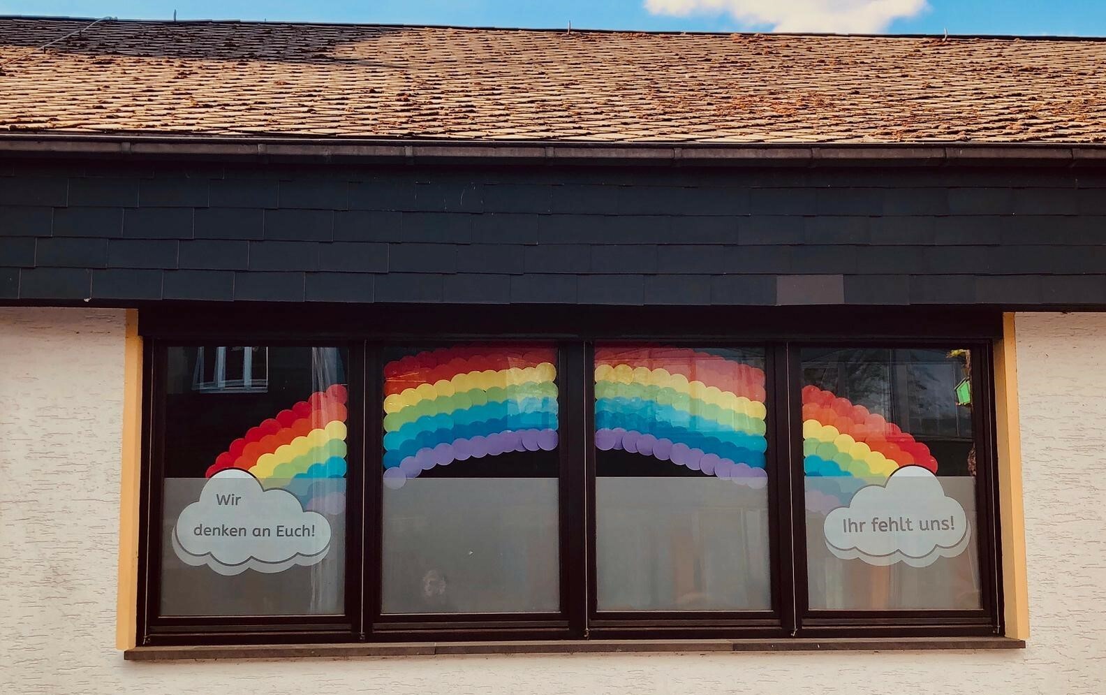Die Mayener Schule sendet ihren Schülerinnen und Schülern einen Gruß in Form eines Regenbogens.
