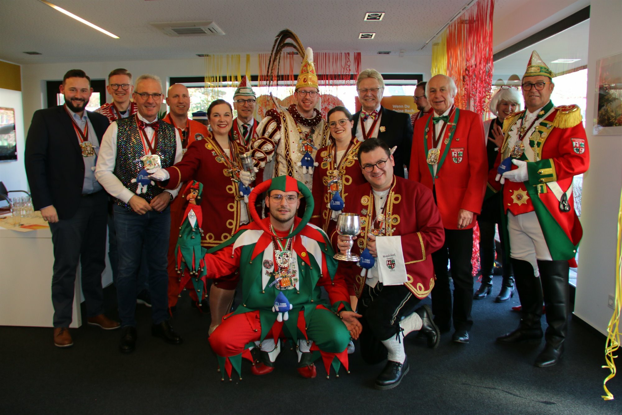 Willkommene Abwechslung im gemeinsamen Kundenzentrum der Stadtwerke Mayen und der Energieversorgung Mittelrhein (evm): Dort, wo es in diesen Tagen eher um ernste Themen wie Gas- und Strompreisbremse, steigende Kosten oder Energiespartipps geht, zog der Mayener Karnevalsprinz Peter IV. samt großem Gefolge ein. "Was für ein Glanz in unserer bescheidenen Hütte", begrüßte evm-Sprecher Marcelo Peerenboom Seine Tollität und dessen Hofstaat. Die Vertreter der Stadtwerke Mayen und der Energieversorgung Mittelrhein bereiteten Prinz Peter IV. einen standesgemäßen Empfang. Mit dabei waren Oberbürgermeister Dirk Meid in seiner Funktion als Aufsichtsratsvorsitzender der Stadtwerke, die beiden Geschäftsführer Bernhard Mauel und Rolf Schäfer, evm-Vorstandsvorsitzender Josef Rönz sowie die Geschäftsführer der Energienetze Mittelrhein, Udo Scholl und Hendrik Majewski, und zahlreiche Mitarbeiter der evm-Gruppe und der Stadtwerke. Beim karnevalistischen Empfang wurden nicht nur warme Worte gewechselt und kühle Getränke konsumiert, sondern auch kräftig gesungen: Prinz Peter IV. stimmte sein Mottolied an und animierte zum Mitschunkeln. Gut gestärkt und mit einem Energieschub in Form klingender Münze ging es für den närrischen Besuch schließlich weiter.