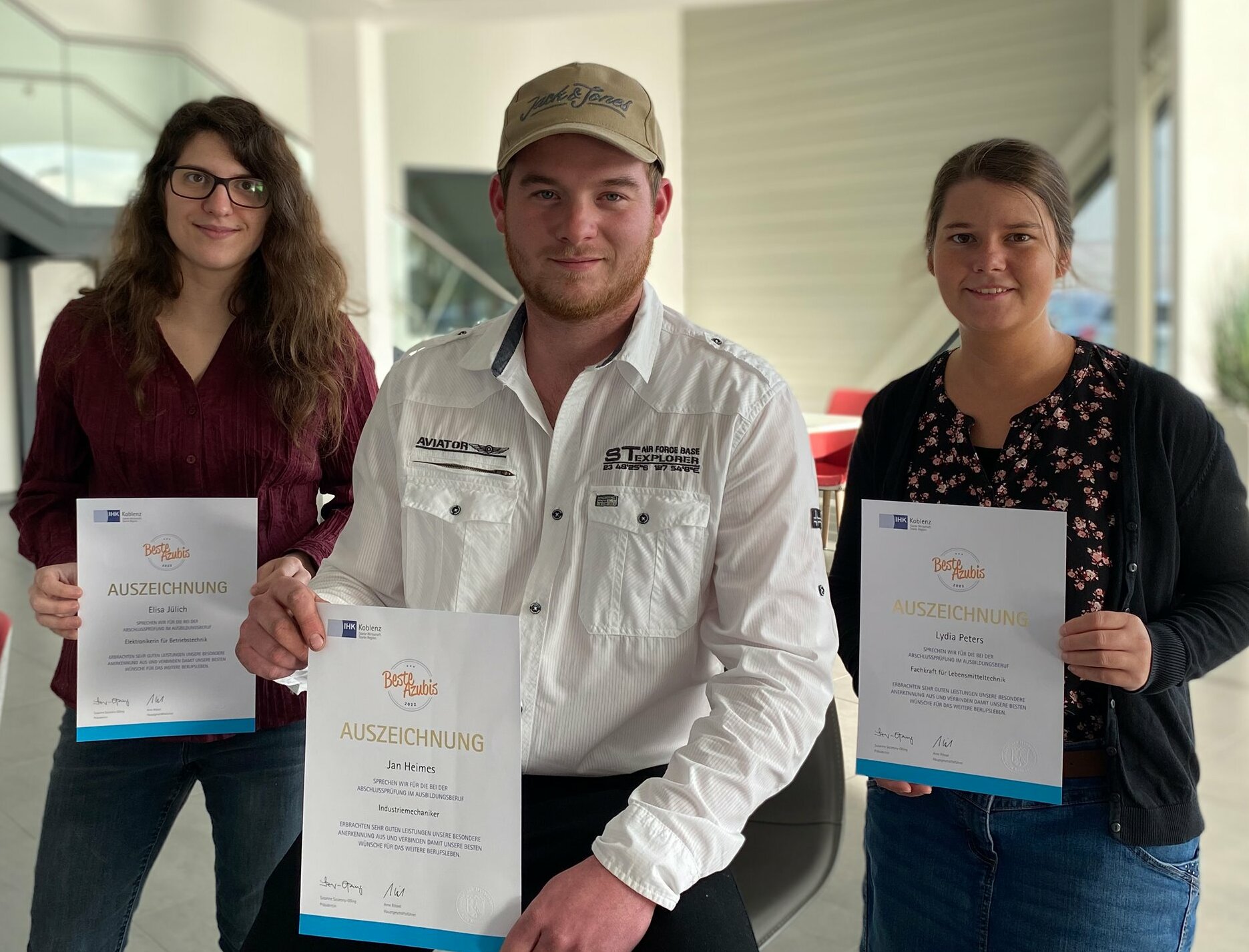 Polch. 16 ehemalige Auszubildende von Griesson - de Beukelaer (GdB) haben ihre Abschlussprüfung bei der IHK Koblenz in diesem Jahr abgelegt. Mit der Gesamtnote »sehr gut« zählen Lydia Peters, Fachkraft für Lebensmitteltechnik, Elisa Jülich, Elektronikerin, und Jan Heimes, Industriemechaniker, zu den Besten in ihrem Jahrgang. »Wir sind stolz, dass unsere Auszubildenden bei den IHK-Abschlussprüfungen mit sehr guten Einzelleistungen überzeugt haben. Sie haben mit ihrem erfolgreichen Abschluss einen wichtigen Grundstein für ihre berufliche Zukunft gelegt und es freut uns umso mehr, dass sie weiterhin Teil unseres Teams sind und sich mit uns weiterentwickeln«, gratuliert Volker Weckbecker, Leiter Ausbildung gewerblich-technische Berufe.