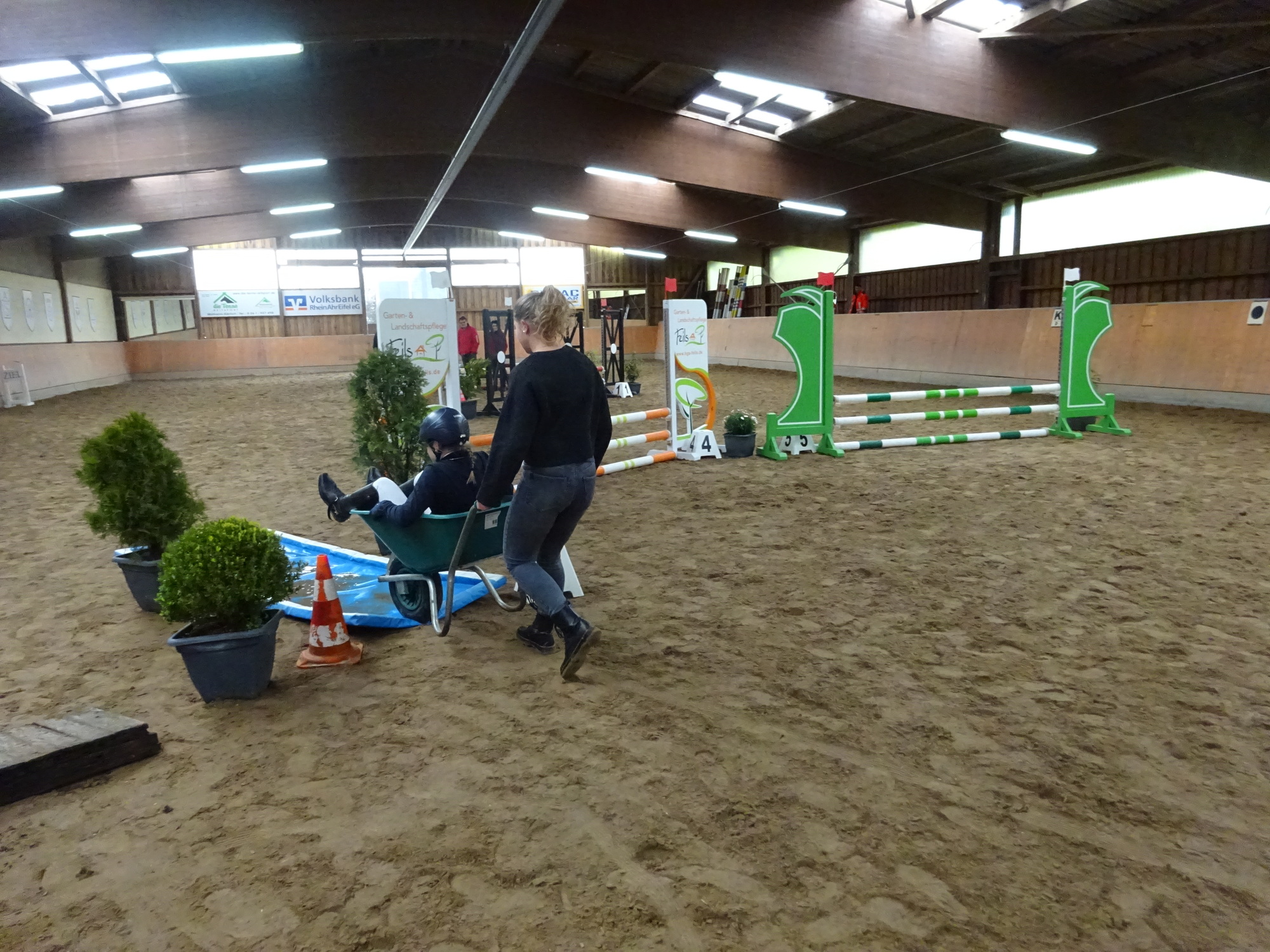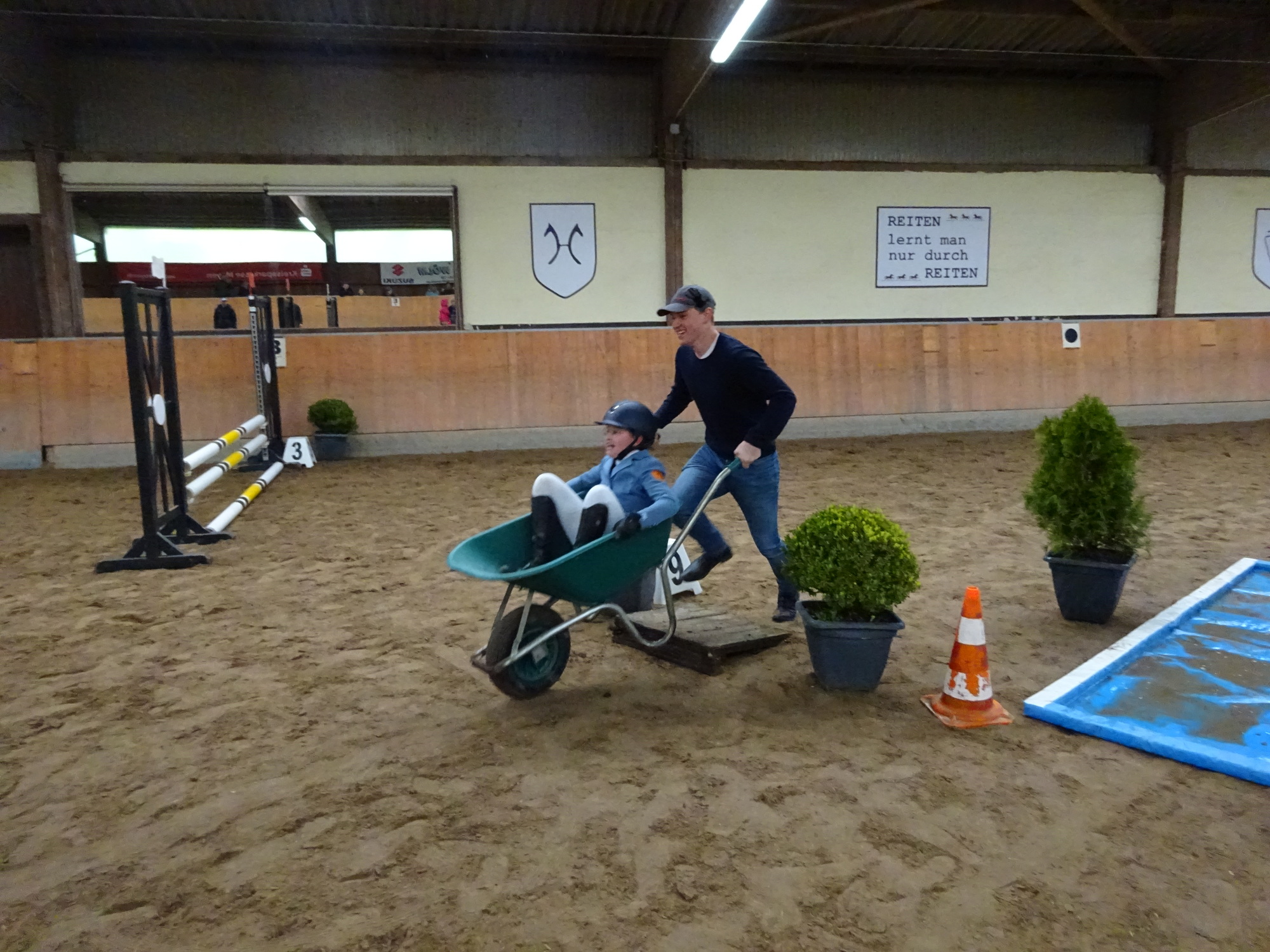 Mayen. Trotz sehr wechselhaftem Wetter haben viele Reiterinnen und Reiter sich auf den Weg nach Mayen auf den Thomashof gemacht. An diesem Reitertag fanden vormittags die Springprüfungen statt. In der Springprüfung 40cm siegte Lillien Adams auf dem Pferd „Sly“, Lisa Kraft auf „Woody“ freute sich über den zweiten Platz und Joy Wißmann auf „Joys“ erreichte den dritten Platz. Das Stilspringen 60 cm wurde von Jule Neuerburg auf „Rivaldi“ souverän gewonnen. Jasmin Theisen freute sich riesig mit „Acambaro“ über den zweiten Platz. Alicia Laubenthal strahlte auf „Alice“ über Platz drei. Das Stilspringen mit Stechen 80cm wurde in einem sehr spannenden Stechen entschieden. Lisa Kraft siegte mit „Floh op Jück“, Annika Wagner auf „Kleine Keks“ freute sich sehr über den zweiten Platz und Alicia Laubenthal wurde mit „Alice“ dritte. Lisa Kraft gewann mit „Floh op Jück“ sensationell die Springprüfung der Klasse A. Die spannendste und lustigste Prüfung war das Jump and Run. Hier lieferten sich zwei Teams ein rasantes Rennen. Die Schubkarrenfahrt ging durch einen Wassergraben und über eine kleine Rampe. Es siegte nach einem sensationellen Ritt, Jule Neuerburg auf „Rivaldi“ mit ihrem Teampartner Tom Braun. Nicht weniger spektakulär ritt Annika Wagner auf „kleine Keks“ mit ihrer Teampartnerin Melina Wagner.
