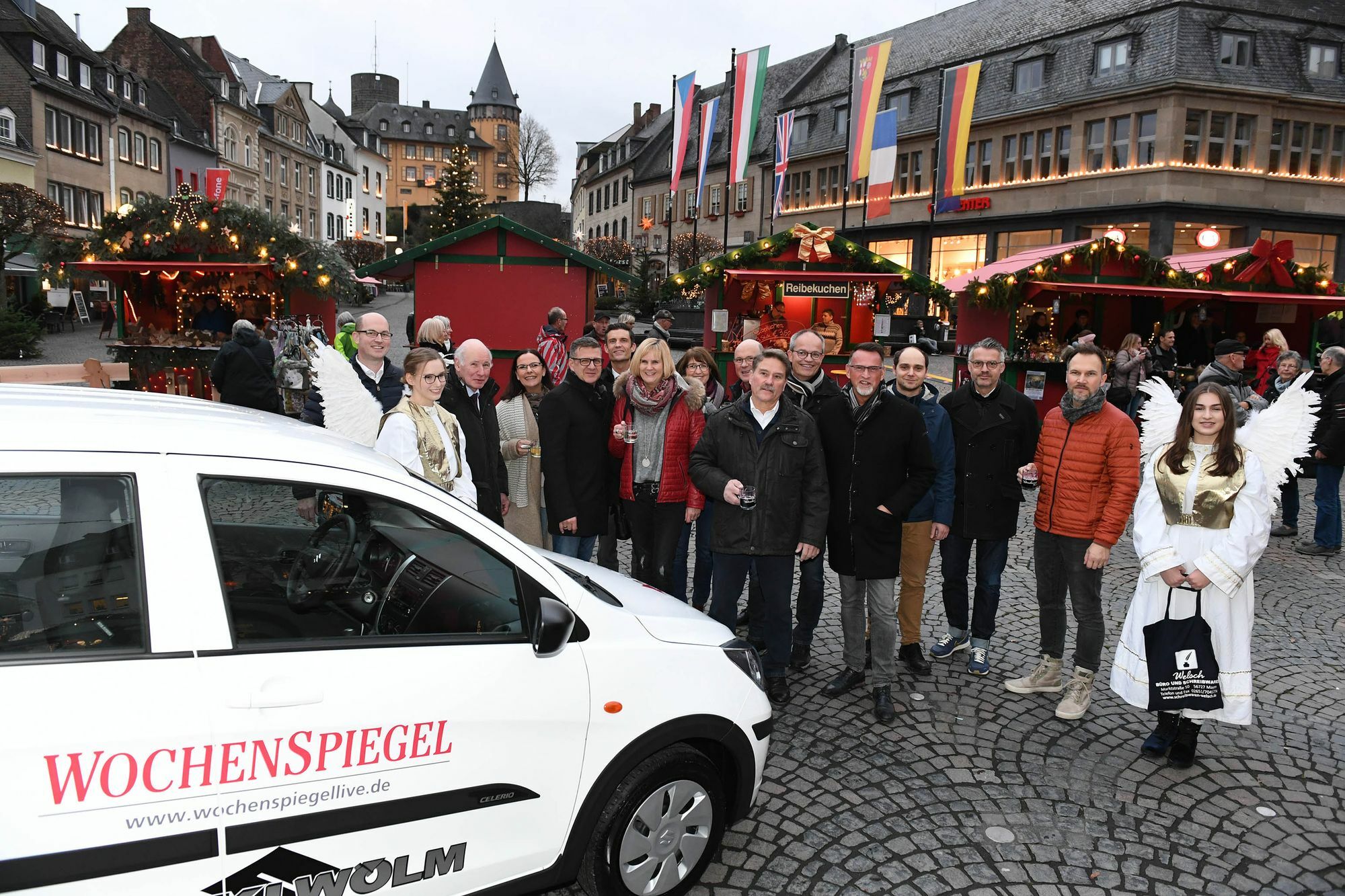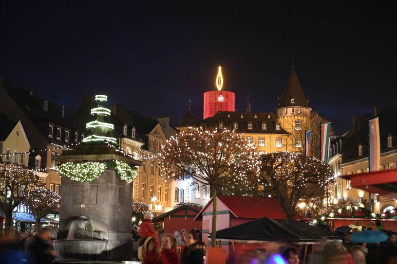 Nach der Eröffnung des Weihnachtsmarktes auf der Bühne mit Oberbürgermeister, Vertretern der MY-Gemeinschaft und Sponsoren präsentierten sie den Hauptgewinn von "Einkaufen und Gewinnen". Danach ging es hinauf zur Genovevaburg, wo mit dem Entzünden der großen "Kerze" - das weithin sichtbare Zeichen - und dem kleinen Feuerwerk auch der Startschuss für den Adventmarkt (bis Sonntag, 2. Dezember) in der Burg gegeben wurde. Am Samstag hatten die Geschäfte zum "langen Einkaufen", dem Latenight-Shopping, eingeladen. Das alles ließ sich prima mit einem Besuch des Weihnachtsmarktes verbinden.