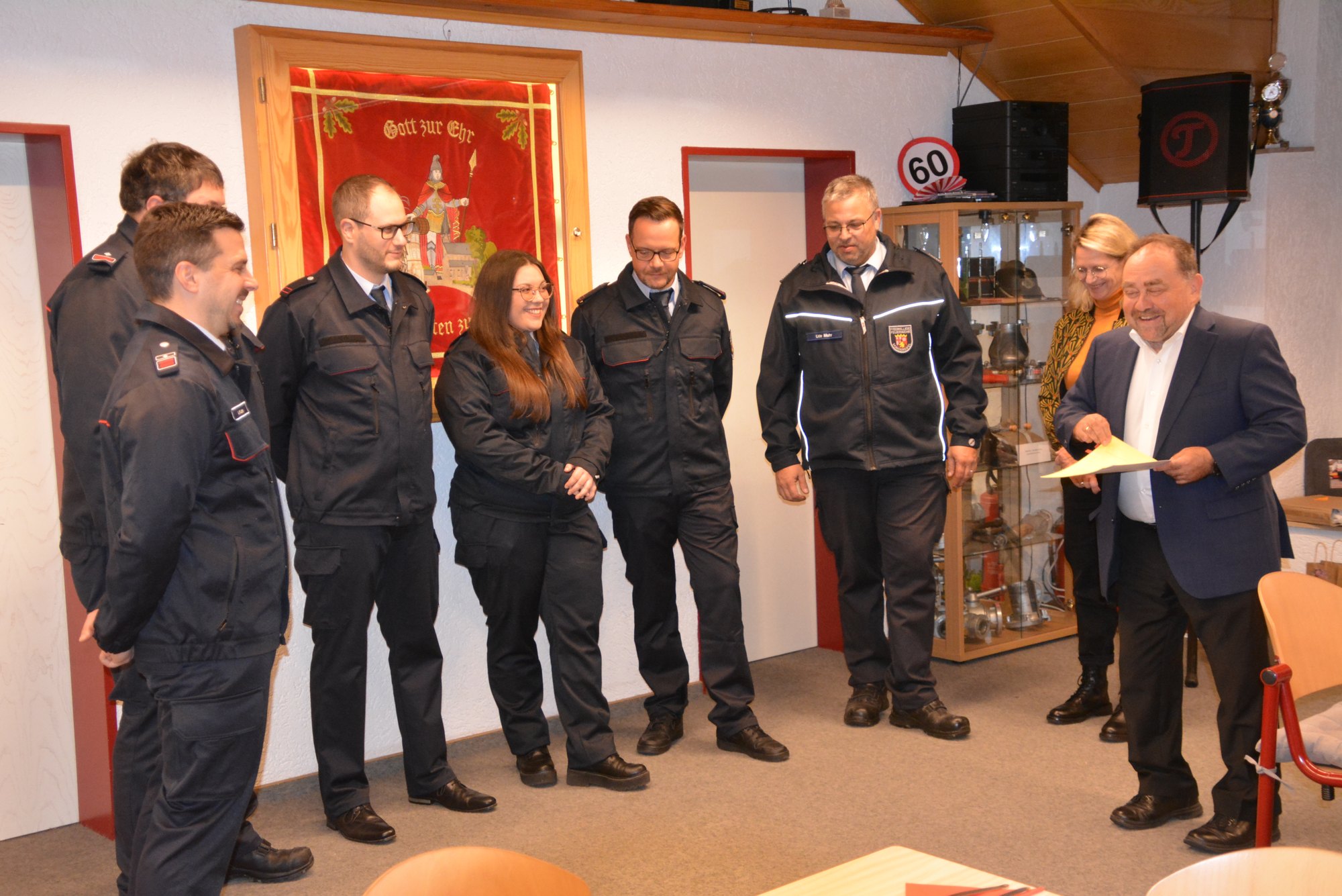 Neuaufnahmen von v.l.n.r. Wehrführer Jens Kuhn, Stv. Wehrführer Tobias Nauert, Sebastian Egger, Celina Kriegesmann, Stephan Severin, Wehrleiter Udo Mohr, Ortsbürgermeisterin Corinna Behrendt und Verbandsbürgermeister Alfred Schomisch bei der Verpflichtung der neuen Mitglieder.