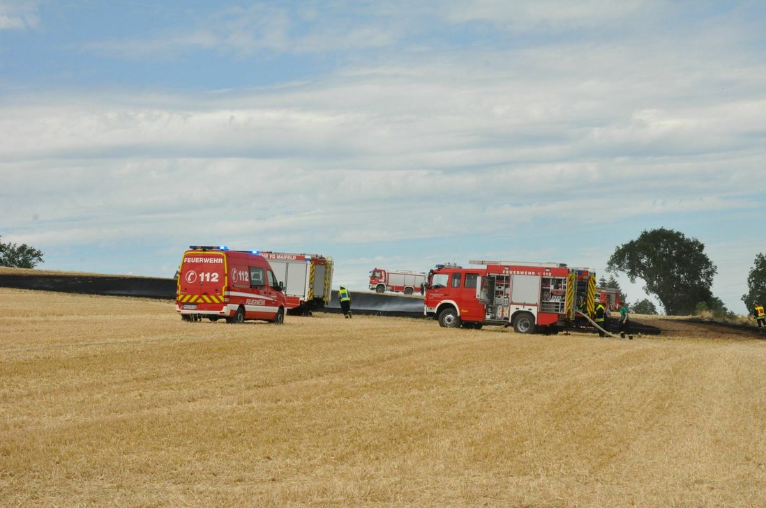 Der Brand war aus ungeklärter Ursache auf einem abgeernteten Feld ausgebrochen. Das Feuer breitete sich rasend schnell aus und drang bis in die Gärten des angrenzenden Wohngebiets vor. Durch den Einsatz der Löschzüge aus Welling, Trimbs, Polch, Münstermaifeld sowie Ochtendung und durch das Umbrechen des Stoppelfeldes war der Flächenbrand schnell unter Kontrolle. Zudem war der Rettungsdienst des DRK vor Ort. Foto: Pauly