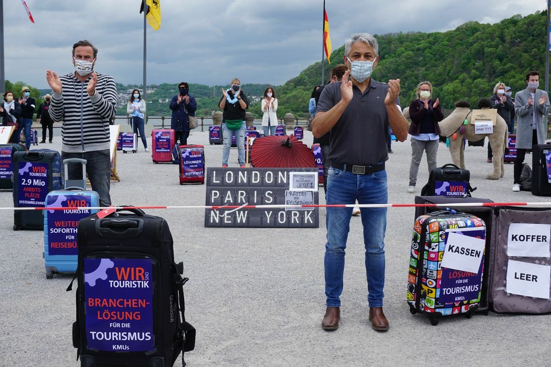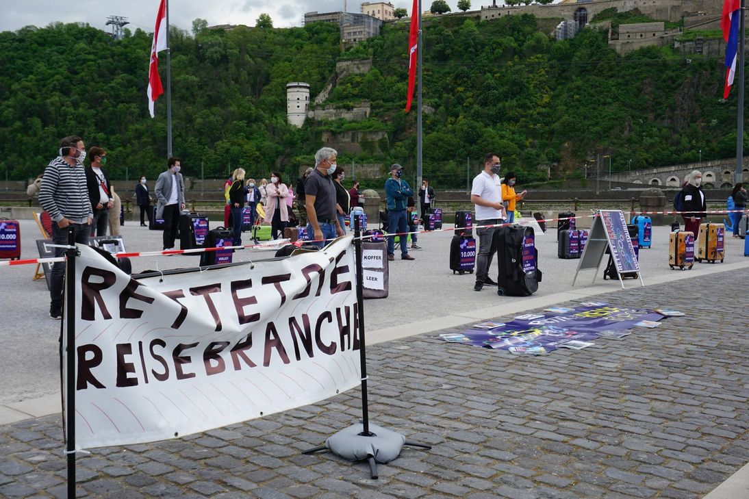 Die Uhrzeit - fünf vor zwölf (11.55 Uhr) - hatte ebenso symbolischen Charakter, wie die leeren Koffer und Liegestühle, die zu Füßen Kaiser Wilhelm I. platziert wurden. Zudem wurde mit Reiseprospekten der Schriftzug "Rettet die Reisebüros" ausgelegt. Organisator Florian Hartmann aus Treis-Karden konnte mehr als 100 Kolleginnen und Kollegen zu der Protestaktion, die bundesweit in 40 Städten zeitgleich stattfand, begrüßen. Sie kamen aus dem Einzugsgebiet Eifel, Hunsrück und Westerwald nach Koblenz. Im Gespräch mit dem WochenSpiegel stellte der Reisefachmann heraus, worum es geht. Er fragt "Milliarden für die Banken und die Automobilbranche, doch was ist mit uns?" Die Botschaft lautet: "Wir sind auch Tourismus." Viele Existenzen seien bedroht. Die Umsätze brächen weg und sie seien in der Corona-Krise dreifach gestraft. Das heißt: Sie müssen Provisionen zurückzahlen, die Büros öffnen, um die Stornierungen abzuwickeln, es gibt keine Aussicht, wann wieder Reisen gebucht werden können. Just am Morgen des Protesttages hatte das Auswärtige Amt die Reisewarnung bis Mitte Juni verlängert. Tourismus sei "systemrelevant", wie Hartmann betonte. Schließlich stehen 2,9 Millionen Arbeitsplätze auf dem Spiel, 11.000 Reisebüros und 3.000 Veranstalter sind in Deutschland betroffen.Er fordert gemeinsam mit seinen Kollegen einen größeren Rettungsschirm von der Regierung.