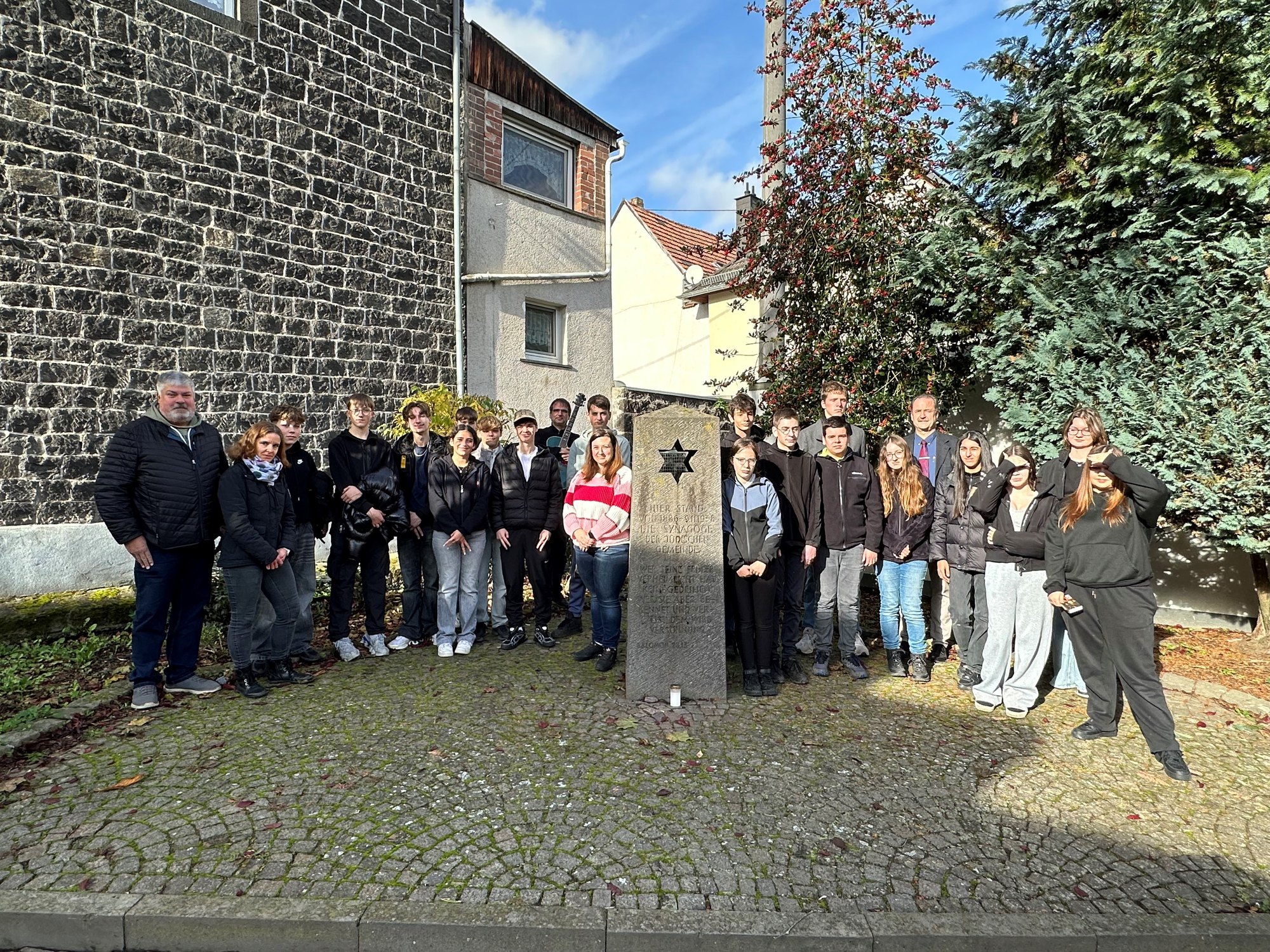 Die Schulgemeinschaft der Laacher See-Realschule plus und Fachoberschule hat schon vor Jahren eine Putzpatenschaft für diese Steine übernommen, um für Schülerinnen und Schüler damit Geschichte vor Ort erfahrbar zu machen – so auch in diesem Jahr. Im Rahmen einer kleinen Feierstunde erinnerten Neunt- und Zehntklässler zusammen mit ihren Lehrerinnen Kristina Merten und Ulrike Waasem, Schulleiter Christian Waters, Stadtbürgermeister Achim Grün sowie der musikalischen Umrahmung von Reinhard Lisicki und einer Sängerin jetzt am Standort der ehemaligen Synagoge an den 9. November 1938 – die Reichspogromnacht. In dieser Nacht wurde auch dieses jüdische Gotteshaus in der Niedermendiger Wollstraße niedergebrannt. Heute erinnert ein Gedenkstein an die Synagoge. „Ich danke allen, die heute die Stolpersteine gereinigt und an der Gedenkstunde teilgenommen haben, um vor den Gefahren von Hass und Ausgrenzung zu warnen“, so Stadtbürgermeister Achim Grün.