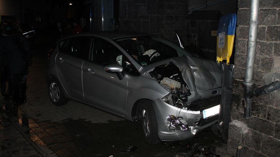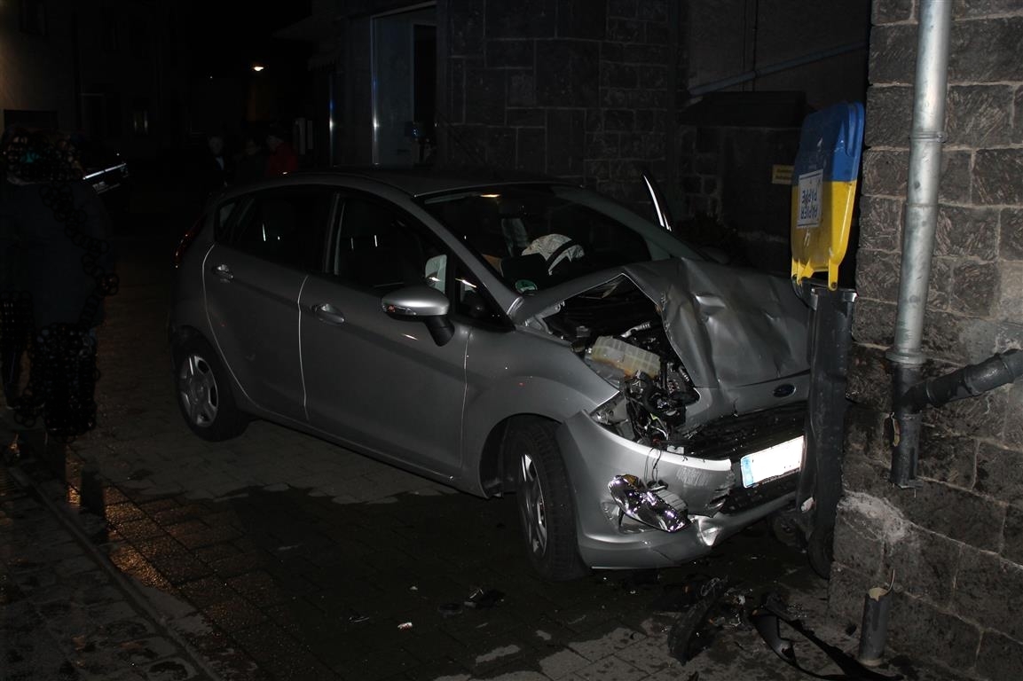 Ein 20-Jähriger kam in einer Rechtskurve der Burgstraße mit seinem Pkw von der Fahrbahn ab und kollidierte mit einer Hauswand. Der junge Mann und sein Beifahrer wurden leicht verletzt und durch den Rettungsdienst zur Untersuchung in ein Krankenhaus gebracht. Das Auto musste abgeschleppt werden. Den Gesamtsachschaden schätzt die Polizei auf 8.500 Euro. Foto: Polizei