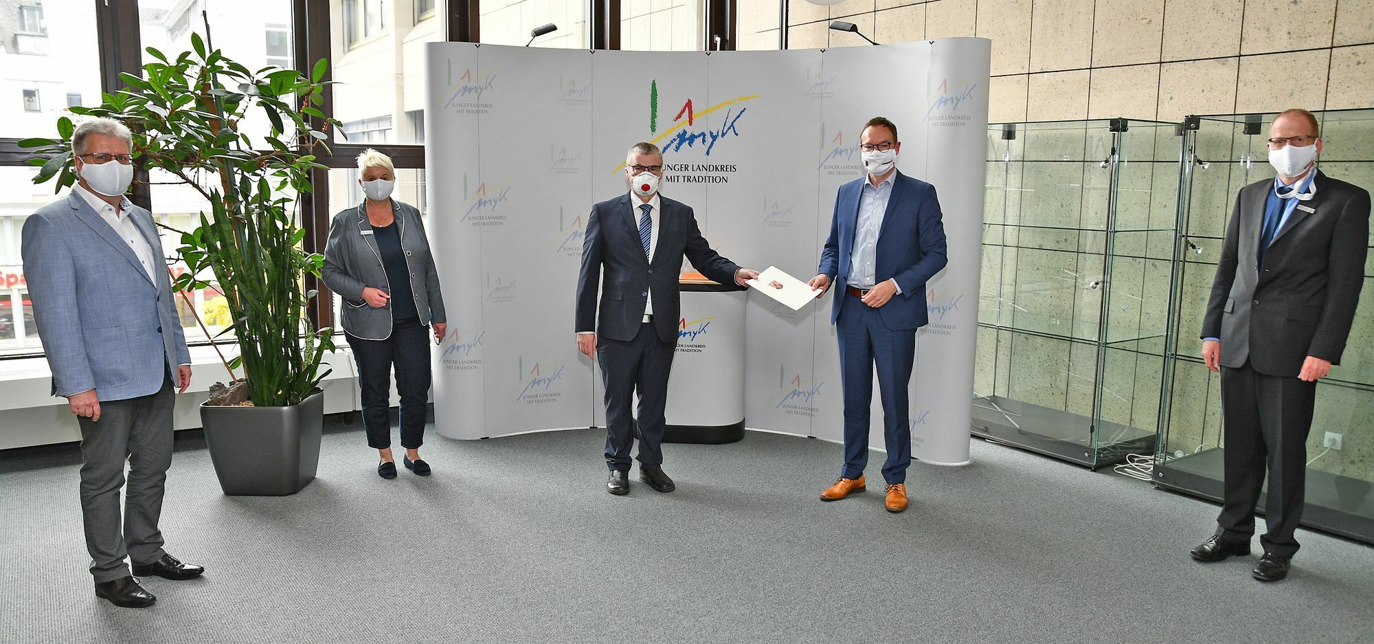 Staatssekretär Dr. Alexander Wilhelm vom rheinland-pfälzischen Gesundheitsministerium verschaffte sich bei einem Besuch in der Kreisverwaltung Mayen-Koblenz einen Eindruck über die aktuelle Corona-Situation im Landkreis und einen Überblick über die Abläufe im Gesundheitsamt. Dabei überreichte er Landrat Dr. Alexander Saftig einen Bescheid über eine einmalige Sonderzahlung für freiwillige Helfer in den Gesundheitsämtern in Höhe von 328.609 Euro, was einem Euro pro Einwohner im Landkreis und Stadt Koblenz entspricht. Verbunden war die Zuwendung mit einem herzlichen Dankeschön des Staatssekretärs an die Mitarbeiter der Kreisverwaltung für ihre Einsatzbereitschaft und die vorbildliche Leistung bei der Bewältigung der Pandemie. Zahlreiche freiwillige Helfer waren für den Landkreis und die Stadt in den vergangenen Wochen unter anderem in den Fieberambulanzen im Einsatz. Auch wurden Freiwillige geschult, um beispielsweise als Pflegehilfskräfte im Bedarfsfall zum Einsatz kommen zu können. „Ich freue mich, das Lob weitergeben zu können. Ich bin sehr stolz auf alle Beteiligten“, so das Fazit vom Landrat.