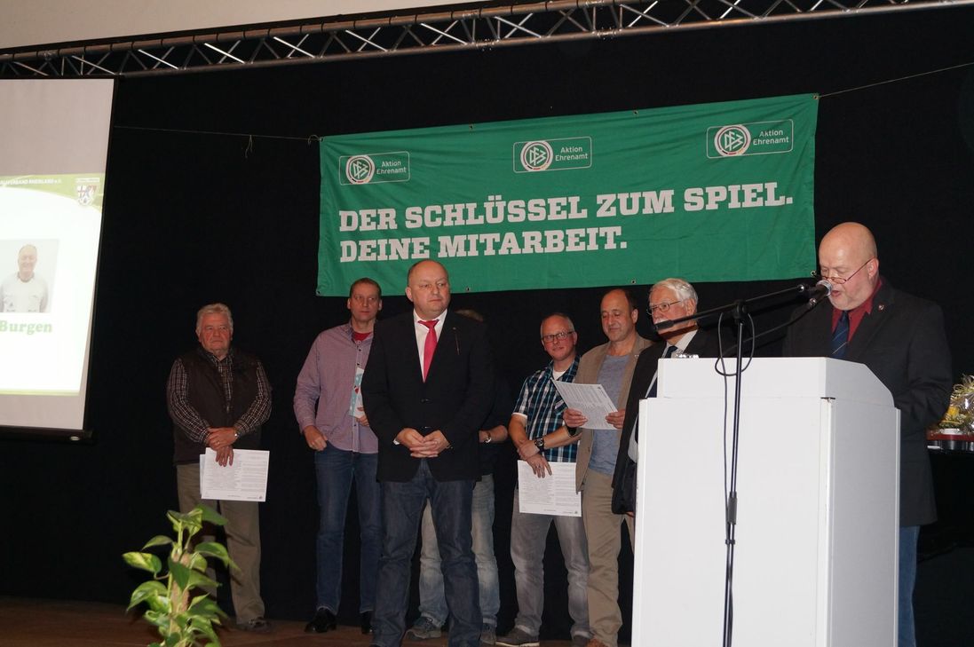 Wenn Lothar Castor aus Burgen sein ehrenamtliches Engagement einmal in Zahlen fassen müsste, würde die Summe seiner Aktivitäten 120 Jahre ergeben. Der Vorsitzende des FC Burgen ist jetzt im Rahmen des Ehrenamtstags des Fußballkreises Hunsrück/Mosel in Cochem mit der Goldenen Ehrennadel des Fußballverbandes ausgezeichnet worden. Zur Verleihung war unter anderem Walter Desch, Präsident des Fußballverbandes Rheinland, gekommen. In seiner Laudatio blickte der Kreisvorsitzende Karlheinz Doerschel weit über den Tellerrand des Fußballs hinaus. Neben seiner Tätigkeit als Schiedsrichter, Vorsitzender, Geschäftsführer und Jugendleiter des FC, war er auch Vorsitzender und Kassierer des Musikvereins Burgen, Kassierer des Gesangvereins Burgen, Schriftführer der Natur- und Heimatfreunde Burgen (bis heute) sowie Mitglied des Gemeinderats. Foto: privat