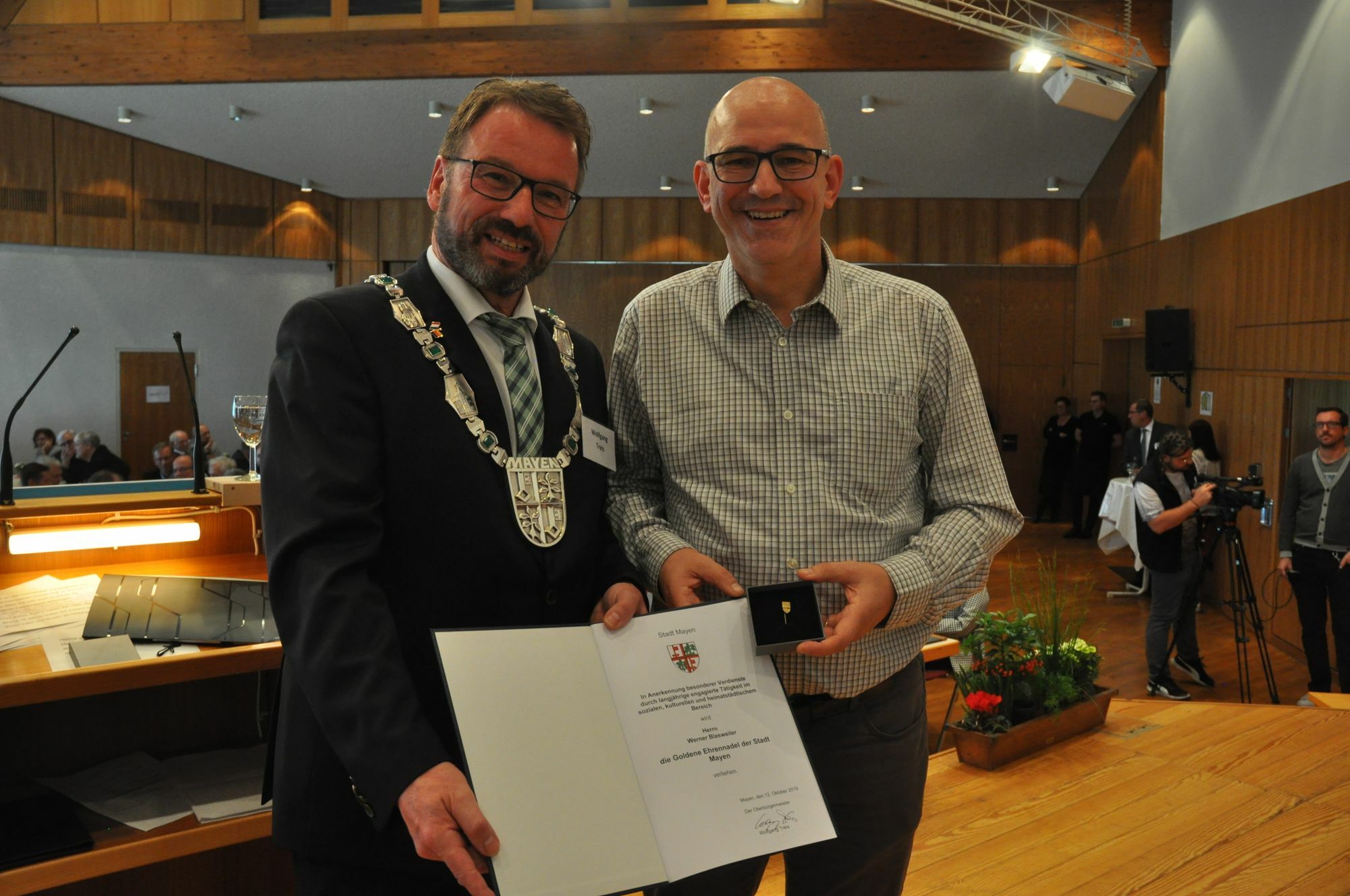 Werner Blasweiler, der seit 2014 Stadtführungen in Mayener Mundart anbietet, hatte zuvor die Gäste des Empfangs wiederholt mit Geschichten und Gedichten in Mayener Platt unterhalten. Der Erhalt der Mayener Mundart liegt Blasweiler seit fast vier Jahrzehnten am Herzen. Unter anderem bereicherte er den Mayener Karneval mit ungezählten Büttenreden. Rund 25.000 Euro, die er als Gage in Stadt und Land erhielt spendete er für soziale Zwecke. Höhepunkt seiner karnevalistischen Karriere war seine Zeit als Prinz Werner I. von Mayen im Jahr 2004. Am Freitag, 22. November, stellt Blasweiler sein Buch "100 Dinge, die man über Mayen wissen sollte" in der Buchhandlung "Reuffel" in der Mayener Marktstraße vor. Foto: Pauly www.mayen.de