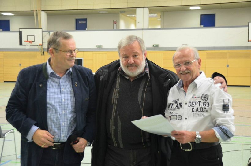 "Er steht ja nicht so gerne im Mittelpunkt", erklärte Kurt Müller (links), VC-Vorsitzender und enger Freund und Weggefährte des Eintracht-Ehrenmitgliedes. Die Goldene Ehrennadel erhielt er von Wilfried Wirths (Mitte), dem VVR-Geschäftsführer Spielbetrieb, der während seiner Zeit als Mendiger Bundesliga-Teammanager den heute 78-Jährigen schätzen gelernt hatte. Sie sei Ausdruck der Wertschätzung für sein außergewöhnliches ehrenamtliches Engagement und seine enormen Verdienste um den Volleyballsport im Rheinland. "Es war immer ein großes Anliegen zu vermitteln, dass Erfolg nur über Leistungsbereitschaft möglich ist", sagte Tretschok, "aber auch, dass man Misserfolg ebenso ertragen können muss, wie man Erfolge feiert. Nur so wächst man als Sportler und Mensch." Foto: privat www.vv-rheinland.de