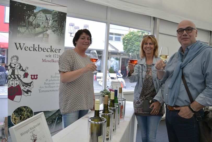 Nachdem in den letzten Monaten das »Bierhaus« die Gazetten dominiert hatte, stand jetzt das »Weinhaus« - sprich Zelt - im Vordergrund. Für das besondere Event konnten Winzer gewonnen werden, die ihre besten Tropfen aus verschiedenen Anbaugebieten (Ahr, Mosel, Baden und Mittelrhein) offerierten. Gourmet-Koch Christian Juresz (Bistro »Pur«) verriet, welche Speisen am besten zu den Weinen korrespondieren. Mitveranstalter - neben der Stadt Mayen - war die »MY-Gemeinschaft«. City-Manager Peter Michels, der das besondere Event intitiiert hatte, äußerste sich gegenüber dem WochenSpiegel zur Premiere. »Wir können sehr zufrieden sein. Mehrere hundert Besucher, besonders in den Abendstunden, nahmen das Angebot - eine gute Mischung von Spitzenweinen, hervorragendem Essen und tollem Ambiente im Premierenzelt - an.« Es zeige, dass Mayen ein großes Potential für Weinfreunde mit Anspruch habe. Auch die Band aus dem Umfeld von Thomas Anders habe für gute Unterhaltung gesorgt. »Wir werden mit der ,MY-Gemeinschaft‘ Gespräche über eine Fortsetzung des Weinforums führen«, kündigt Peter Michels an. Fotos: Kruft
