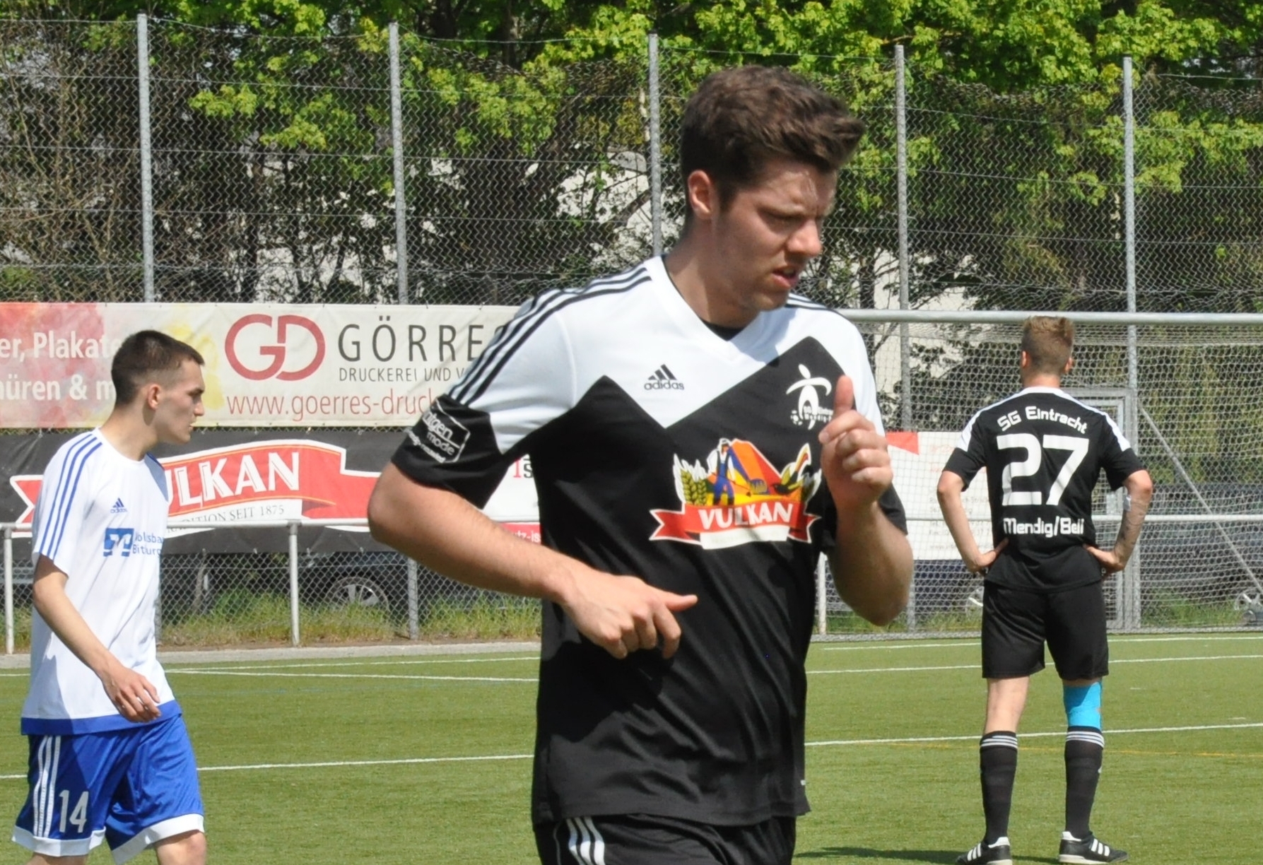 Zwei Tore von Mark Spohler (Foto, 4. 15.) brachten die Gastgeber früh auf die Siegerstraße. Im Laufe der ersten Halbzeit wurden die Gäste aus der Eifel stärker und kamen nach Fehlern in der Mendiger Defensive zu zwei sehr guten Möglichkeiten. Spätestens mit dem 3:0 durch Niklas Heinemann (50.), dessen Flankenversuch im Tor landete, war die Partie entschieden. Der starke Damir Mrkalj, der zunächst die Innenverteidigung gut organisierte, machte mit dem 4:0 (78.) den Deckel drauf. "Damir stellt sich als Vollblutstürmer schon seit Wochen in den Dienst der Mannschaft. Deshalb freut es mich besonders, dass er heute getroffen hat", so Florian Stein. Am Mittwoch, 3. Mai, 18.45 Uhr, muss die SG Eintracht allerdings beim Tabellenletzten SV Leiwen nachlegen, will das Team den Ligaverbleib noch aus eigener Kraft realisieren. "Es war ein guter Auftakt in die Woche der Wahrheit, mehr nicht", verlor Stein nach dem "Dreier" nicht die Realität aus den Augen. Vier Spieltage vor dem Saisonende hat Mendig fünf Punkte Rückstand auf den ersten möglichen Nichtabstiegsplatz - und auf dem steht zurzeit die SG Kyllburg mit 33 Punkten. Foto: Pauly www.sgeintrachtmendigbell.de