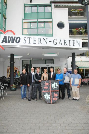 Die Hämmerzunft überreichte zum einen die Einnahmen aus dem Kinderschminken beim Stein- und Burgfest an die Vertreterin der Arbeiterwohlfahrt (AWO) Mayen, Doris Laux: 250 Euro sind bei dieser Aktion zusammen gekommen. Und dann hatten sich die Handwerker - um Zunftmeister Erich Nöthen und Sascha Blümling - im Jubiläumsjahr "725 Jahre Stadtrechte" aber noch etwas Besonderes einfallen lassen: ein großes Mayener Stadtwappen aus heimischen Materialien, erstellt durch verschiedene Zunftbetriebe, nach einer Idee der Dachdeckergesellen der Firma Nöthen. Dieses Wappen wurde beim Stein- und Burgfest für 520 Euro versteigert. Neuer Besitzer wurde der Unternehmer Moritz J. Weig. Auch der Erlös aus dieser Aktion der Hämmerzunft wird der "Weihnachtsbaumaktion des AWO Ortsvereins Mayen" zu Gute kommen. Foto: JasminFranz/Stadt Mayen