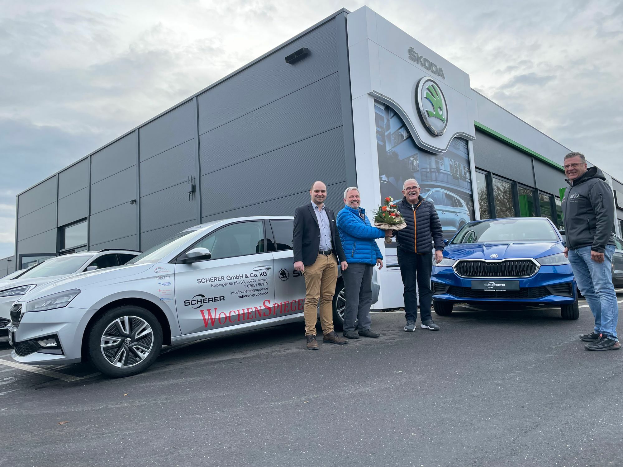 In der gesamten Adventszeit wurden 2.000 Lose verkauft und es warteten attraktive Wochen- und Direktgewinne. Höhepunkt der Aktion war die Verlosung des Hauptgewinns am Vierten Advent. Aus allen Losen wurde das von Hans Molitor gezogen (wir berichteten). Kurz vor Weihnachten konnte er den blauen "Skoda Fabia Active" im Autohaus Scherer in der Kelberger Straße entgegennehmen, Er wird noch in dieser Woche zugelassen. Es gratulierten nochmals Rudi Giering, Verkaufsleiter Autohaus Scherer, Jürgen Nett, Vorsitzender der MY-Gemeinschaft, und Andreas Persie, Geschäftsstellenleiter WochenSpiegel in Mayen. Sie wünschten dem Gewinner Hans Molitor »Allzeit gute Fahrt!«