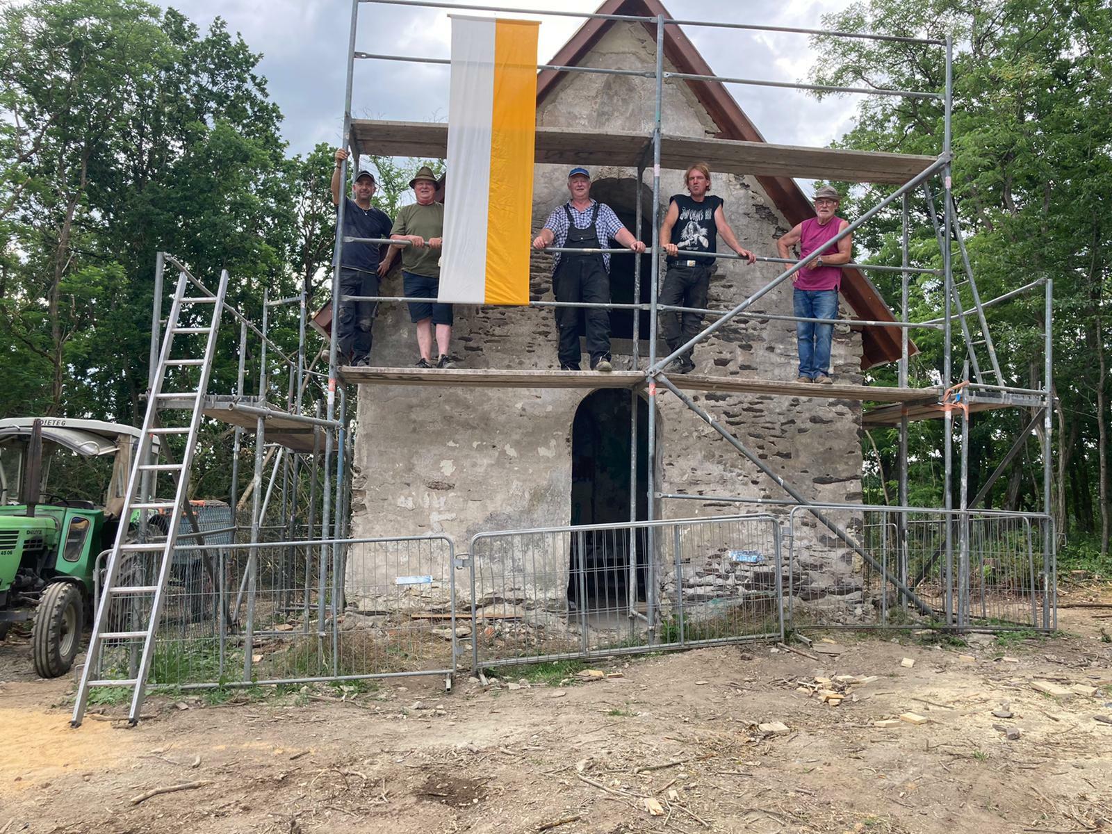 Direkt am Pyrmonter Felsensteig gelegen, der 2015 zu Deutschlands schönstem Wanderweg gekürt wurde, wies bis vor wenigen Wochen nur eine Informationstafel auf die 175-jährige Geschichte von "Allebrauns Heiligenhäuschen" hin. Laut dieser Tafel soll die Kapelle 1856 von der Naunheimer Franziskanernonne Salome Braun "aus tiefer Gläubigkeit" erbaut worden sein. Sie stammte aus dem Hause "Allebrauns" in Naunheim. Einer von vielen alten Familiennamen, die heute auf Tafeln an den Häusern der Maifeldgemeinde angebracht sind. Das Grundstück auf dem die Kapelle steht, gehört einer großen Erbengemeinschaft. Einige sollen, so der Naunheimer Karl-Heinz Fink, in den USA zu Hause sein. "Die sind aber wohl nicht aufzufinden", erklärt der Mann, der den Impuls zur Sanierung der Kapelle gab. "Als ich in den Ruhestand gegangen bin, habe ich mir diese Aufgabe gestellt", erzählt der ehemalige Garten- und Landschaftsbauer. Und mit seiner Idee blieb er nicht lange alleine. Der Zustand der Kapelle war auch Zimmermeister Lothar Stein aus Kollig ein Dorn im Auge. "Ich habe schon vor vielen Jahren bei einem Spaziergang zu meiner Frau gesagt, hier muss etwas geschehen", berichtet der ehemalige Holzbauunternehmer. Gesagt, getan! Fink und Stein fanden schnell weitere Handwerker als ehrenamtliche Mitstreiter. Arnold Klinkner, Thomas Gödert, Stefan Arenz, Stefan Schreiber und Herbert Liesenfeld waren vom Start weg begeistert und die ersten Früchte der Arbeit können sich sehen lassen. Denn die Kapelle war zuletzt nur noch eine Ruine mit beschmierten Wänden. Kein "Leuchtturm" an einem Traumpfad, der jährlich von tausenden Menschen "erwandert" wird. Dabei war der Dachstuhl eines der Mammutprojekte. "Ich habe den Plan erstellt", schaut Stein zufrieden auf das Ergebnis. Karl-Heinz Fink hatte zuvor Bruchsteine organisiert und damit das Mauerwerk saniert Zudem wurde das Gewölbe stabilisiert. "Innen muss jetzt noch verputzt und außen der Bruchstein verfugt werden. Für den Boden habe ich schon einen Basaltbelag und ein Altar darf natürlich auch nicht fehlen", zählt der Naunheimer auf, was neben der Dacheindeckung und dem Außenbereich noch zu tun ist. Im kommenden Jahr soll das Heiligenhäuschen in neuem Glanz erstrahlen. Was für die Kapelle galt, trifft auch auf den Kreuzweg zu, der zu dem kleinen Sakralbau führte. Lediglich die Bruchsteinsockel der einzelnen Stationen sind noch zu sehen. Die auf den Sockeln aufgesetzten Bildnischen wurden 1930 in die Kirche nach Naunheim gebracht, wo sie sich heute noch befinden. Hier will Fink mit dem Aufsetzen einer Basaltplatte zumindest den Erhalt sichern. Wer für den Wiederaufbau von "Allebrauns Heiligenhäuschen" spenden will, kann sich an Karl-Heinz Fink (0 26 54 / 73 83) oder Lothar Stein (01 71 / 5 04 38 87) wenden. Fotos: privat / Pauly