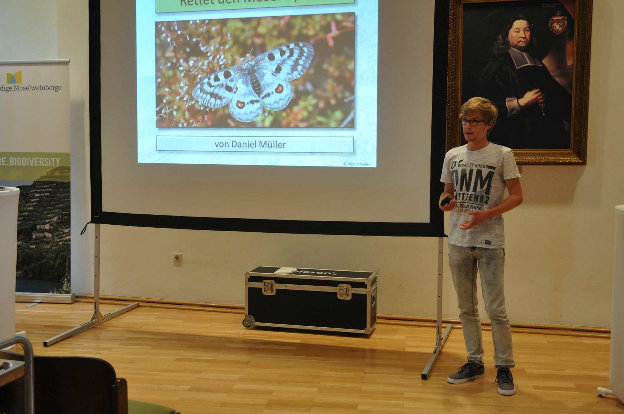 Wer ein Wappentier für die untere Mosel sucht, der kommt am Apollofalter nicht vorbei. Der Mosel-Apollo gehört zu den nach Süden ausgerichteten Weinbergsterrassen an der Untermosel und rund um Cochem. Die Bestände sind in den vergangenen Jahren stark zurückgegangen, berichtete der Schmetterlingsexperte Daniel Müller bei der Vorstellung der Broschüre "Im Reich des Apollofalters – Die drei Leuchtpunkte im unteren Moseltal" im Festsaal des Schlosses von der Leyen in Gondorf. Weshalb der Mosel-Apollo vom Aussterben bedroht ist, sei, so Müller, nicht hundertprozentig auszumachen. "Wir wissen es nicht. Vielleicht ist es die Verbuschung nach Nutzungsaufgabe der Weinberge, vielleicht ist es der Eintrag von Luftstickstoff, die Trockenheit und der Klimawandel", zählte der Experte auf. Klar sei aber, dass eine Steigerung der Lebensraumqualität wahrscheinlich positive Folgen haben könnte. Dazu gehörten gehölzfreie Felsnasen und Trockenmauern sowie blütenreiche Säume. Eine Bestandsaufnahme, die ein Plädoyer für die Biodiversität an der unteren Mosel ist. Deshalb wurde auch das Projekt "Leuchtpunkte der Artenvielfalt" initiiert, das es mittlerweile 17-mal an der Mosel gibt. An der unteren Mosel sind das die Lehmener Würzlay, der Koberner Schlossberg und die Winninger Weinbergterrassen. Die Interessengemeinschaft der Naturerlebnisbegleiter, die als Pate der Leuchtpunkte fungiert, aus Lehmen, Kobern-Gondorf und Winningen will mit der jetzt aufgelegten Broschüre das Interesse für die teils Jahrtausende alte Kulturlandschaft und deren biologische Vielfalt wachhalten. Vieles sei vermeintlich selbstverständlich, vieles aber auch unbekannt, obwohl direkt vor der eigenen Haustür, erklärte Dieter Möhring von den Lehmer Razejunge die Motivation die Leuchtpunkte in Schrift und Bild festzuhalten und bekannt zu machen. Die Broschüre, die von Sponsoren finanziert wurde, bietet informative Texte und detailreiche Fotos von der Pflanzen- und Tierwelt. Sie sollen den Betrachter neugierig machen, damit er selbst Lust bekommt die einzigartige Natur zu erleben und zu entdecken. Fotos: Pauly www.lehmer-razejunge.de