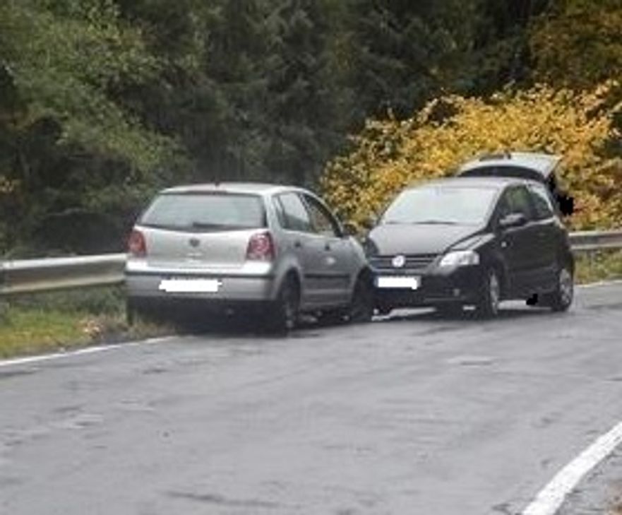 Eine "Polo"-Fahrerin verlor in einer Rechtskurve auf regennasser Fahrbahn - von Mayen kommend in Fahrtrichtung Hausten-Morswiesen - die Kontrolle über ihr Fahrzeug und stieß mit einem ihr entgegenkommenden "VW Fox" zusammen, dessen Beifahrerin leicht verletzt wurde. Beide Pkw mussten abgeschleppt werden.  Foto: Polizei
