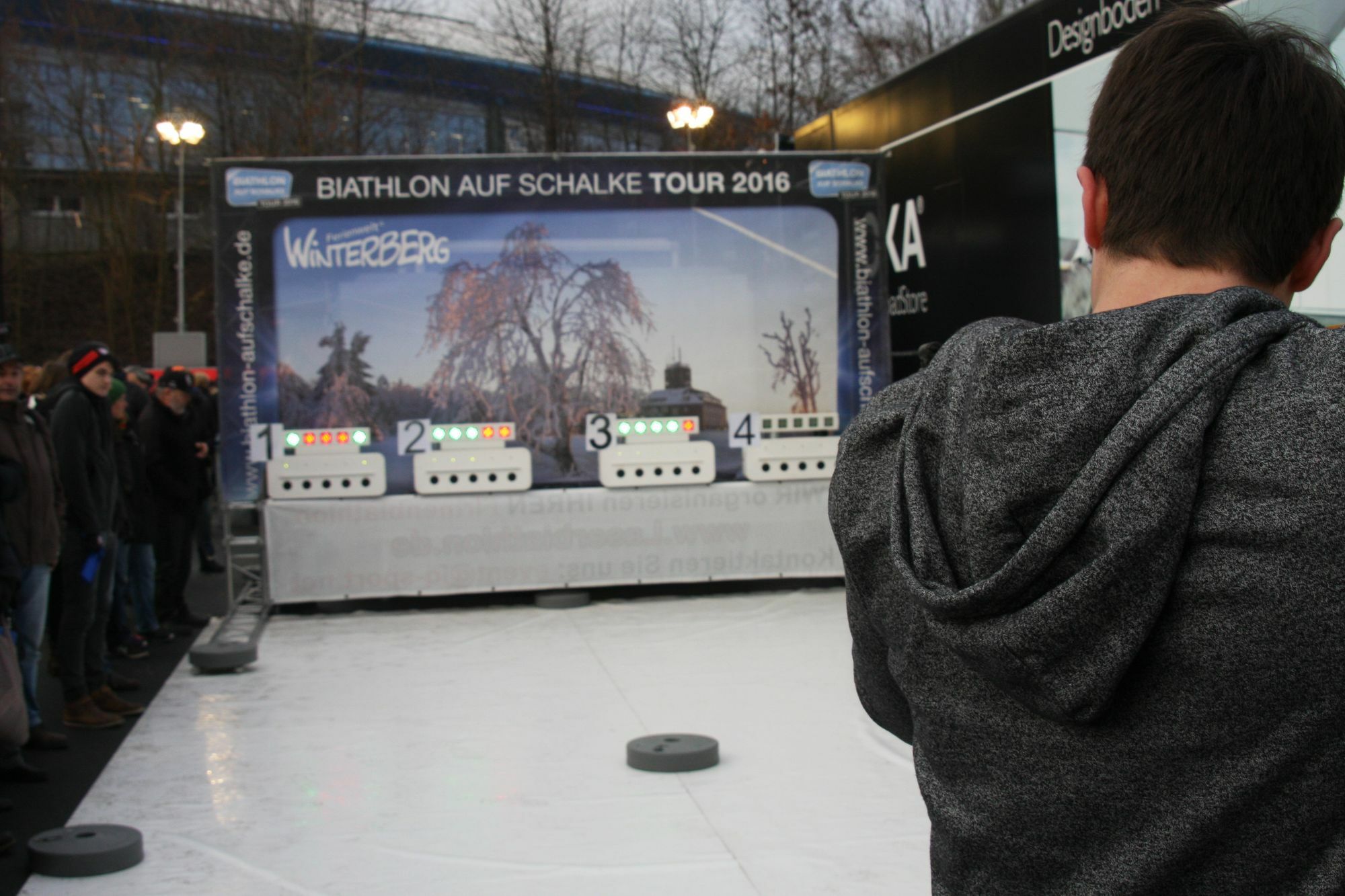 Am Alten Rathaus der Stadt Mayen erhielt die Biathlonarena von der gastgebenden MY-Gemeinschaft den idealen Platz und zudem mit dem "Autohaus Nett" und "Intersport Krumholz" zwei Förderer an die Seite gestellt. Neun jeweils vierköpfige Staffeln traten zur 1. Mayener BiathlonStaffel-Stadtmeisterschaft an. Alle Teilnehmer legten 400 Meter simulierten Skilanglauf zurück und schossen mit dem Laser-Biathlongewehr fünf Schüsse aus zehn Metern Entfernung auf 60 Millimeter große Ziele. Jeder Fehlschuss "kostete" 15 Strafsekunden. Sieger wurden die Jungschützen vor dem "Autohaus Nett". Einen phantastischen Wettkampf lieferte vor allem Marvin Nett ab, der die Bestzeit der Tour mit 1:47 Minuten ohne Fehler ablieferte. Der 20-jährige Hobby-Skiläufer und Spaßfußballer hatte außer etwas Kirmesschießen keinerlei Schießerfahrung. Beim Finale in der Arena auf Schalke konnte er erneut einen starken Wettkampf zeigen. Im Halbfinale hatte er Pech, traf mit den ersten vier Schüssen und hätte bei einem fünften Treffer das Finale der letzten Vier erreicht. Doch der Treffer wollte ihm nicht gelingen. Als 7. von 38 Finalisten gewann er Eintrittskarten der besten Kategorie für den Biathlon auf Schalke. Fotos: Biathlon-Tour.de