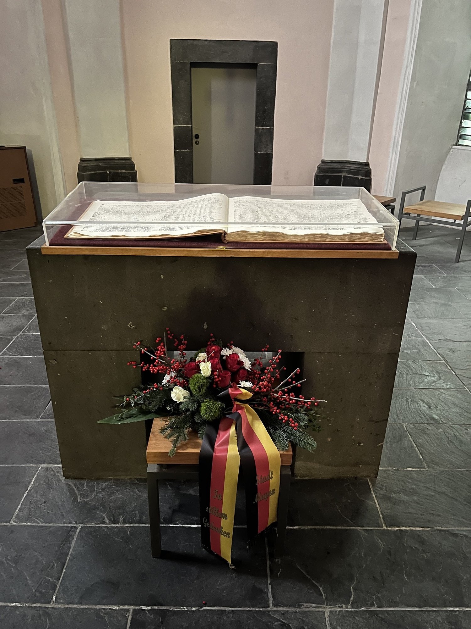 Im Anschluss haben alle Besucherinnen und Besucher die Möglichkeit, die Heilig-Geist-Kapelle zu betreten, um dort das Buch mit den Verstorbenen des Luftangriffs anzuschauen.