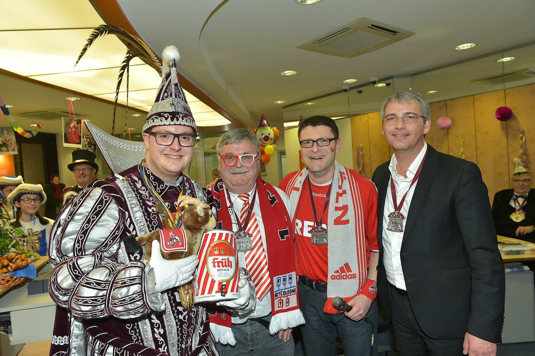 "Mendig Ahoi - D´r Prinz kütt!" hieß am Karnevalsfreitag in der Filiale der Volksbank RheinAhrEifel in Mendig. Prinz Timo I. war zusammen mit seinem Hofstaat und großem Gefolge zu Gast und nutzte seinen Besuch um eine Autogrammstunde im Schalterraum abzuhalten. Direktor des Regionalmarktes MayenRhein, Oliver Engels, sowie der Vorstand der Volksbank RheinAhrEifel, Sascha Monschauer, begrüßten die närrischen Gäste und freuten sich, dass Timo die Tradition der Autogrammstunde weiter führt. Bereits seit den frühen 80er Jahren waren immer wieder Prinzen oder Prinzessinnen bei der Volksbank zu Gast gewesen, um sich dem närrischen Volk zum Start des Straßenkarnevals zu präsentieren. Für Prinz Timo hatte die Volksbank noch einen besonderen „Leckerbissen“ vorbereitet: Geschäftsstellenleiter Bernd Kill überreichte dem leidenschaftlichen Fan des 1. FC Köln einen Plüsch Geißbock, der ihn in den letzten Tagen der Karnevals-Session – und darüber hinaus begleiten soll. Foto: Seydel