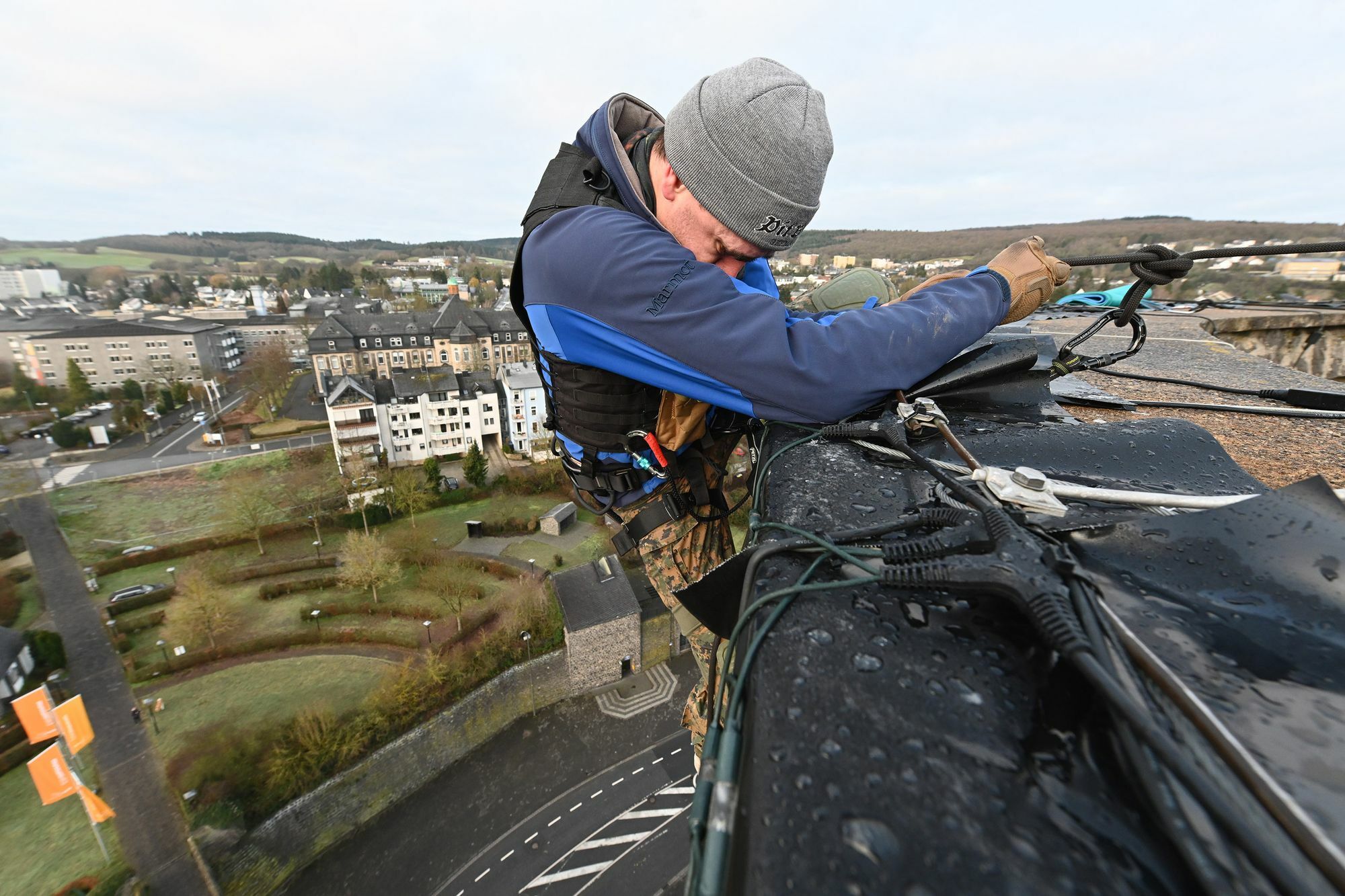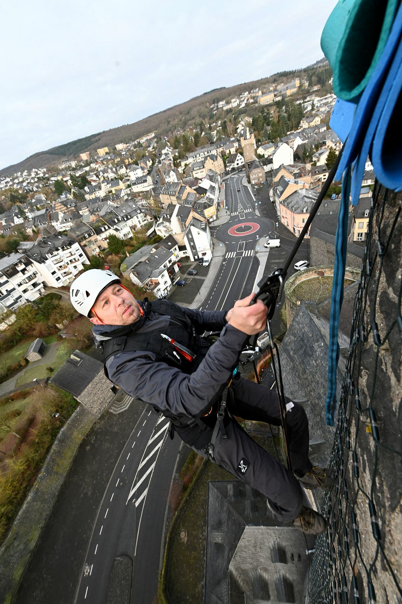 In der Adventszeit ist sie schon von weitem sichtbar - die große Kerze am Goloturm der Genovevaburg. Sie ist seit vielen Jahren äußeres Zeichen für die Eröffnung des Weihnachts- und Adventmarktes in Mayen. In der Woche nach dem Dreikönigstag wurde sie wieder abgebaut. Schwindelfrei mussten dafür die beiden Kletterer sicher sein. Aber als Profis konnten sie die Arbeiten zur Zufriedenheit aller erledigen. Foto: Walz