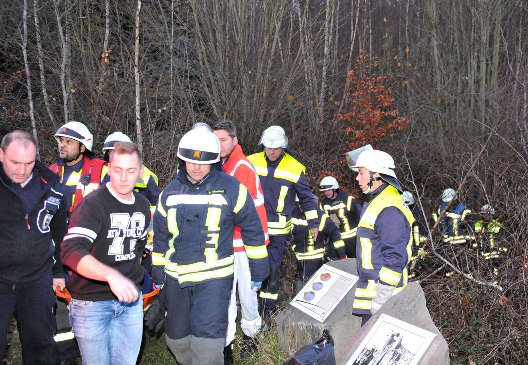 Der Mann, der mit zwei Freunden in der Lay klettern war, stürzte aus einer Höhe von rund fünf Metern ab. Einsatzkräfte der Freiwilligen Feuerwehren aus Ettringen und Kottenheim und des DRK konnten den Verletzten aus dem unwegsamen Gelände zu einem Rettungswagen transportieren, der ihn in ein Krankenhaus brachte. Foto: Walz