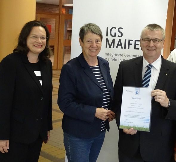 Im Rahmen der Nationalen Klimaschutzinitiative (NKI) hat der Landkreis Mayen-Koblenz eine Förderung für die Sanierung der Innenbeleuchtung der Flure in der IGS Maifeld erhalten. Bundesumweltministerin Dr. Barbara Hendricks ließ es sich zusammen mit Bundesarbeitsministerin Andrea Nahles nicht nehmen, die Übergabe des Zertifikats an Landrat Dr. Alexander Saftig persönlich vorzunehmen und betonte die Vorbildfunktion der Schule.