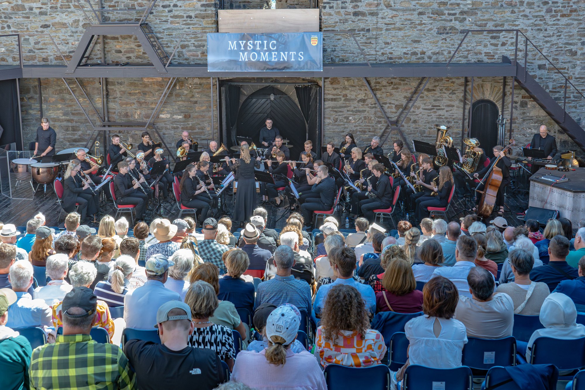 In Vertretung des Intendanten der Burgfestspiele, Alexander May, begrüßte Thorsten Hamer die erstaunlich zahlreichen Gäste. Diese konnten das Konzert bei strahlendem Sonnenschein genießen, während das Orchester ganz seinem Motto getreu im mystischen Schatten des Burghofs aufspielte. Durch das Programm führte zum wiederholten Male für die Blaskapelle gekonnt Jutta Schuster.