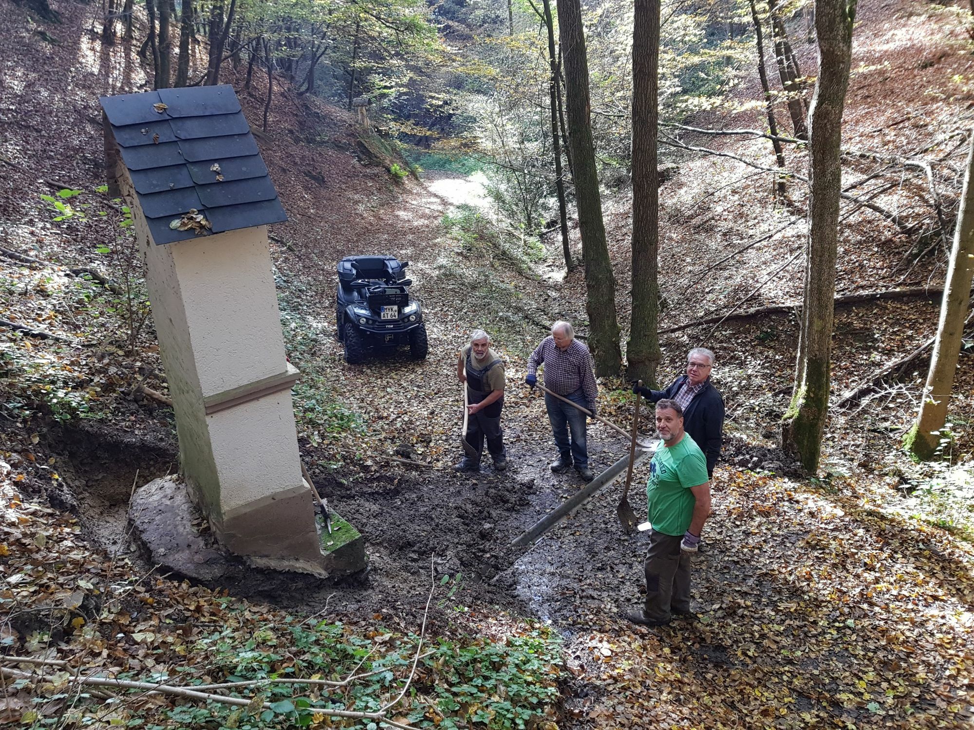 An der 10. Station hatte man einen Schaden festgestellt. Anfallendes Bergwasser hatte das Fundament unterspült und die Station drohte instabil zu werden. Zunächst musste das Fundament komplett frei gegraben und im Anschluss neu verputzt werden. Damit das Fundament künftig vor Feuchtigkeit geschützt bleibt, wurde noch ein Drainagerohr verlegt und der Graben mit grobem Schotter verfüllt. Die rund 150 Jahre alte Station wird so wohl auch die nächsten Jahrzehnte sicher überstehen. Die erforderlichen Materialien wurden über Spenden finanziert. Für die 250 Euro, die die Gruppe im Rahmen des Kreiswettbewerbes "Unser Dorf hat Zukunft" als Prämie erhalten hat, wird sie in Kürze die Schiefereindeckung einer weiteren Station erneuern. Foto: privat www.loef-kattenes.de