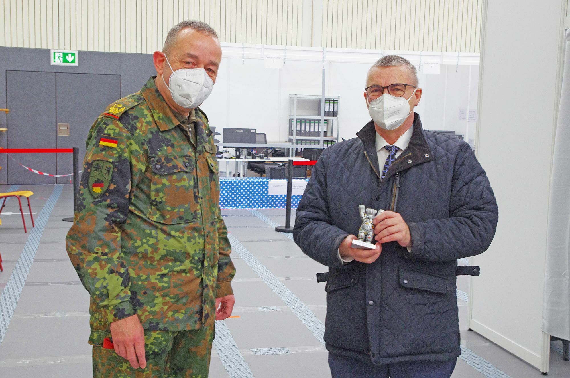Die Bundeswehr unterstützt den Landkreis Mayen-Koblenz bereits seit November in der Corona-Lage. Die Soldaten unterstützen dabei die Arbeit des Gesundheitsamtes im Kreishaus, die Corona-Ambulanz in Mayen und das Impfzentrum Polch. Einen eigenen Eindruck vom Einsatz der Soldaten verschaffte sich jüngst Generalmajor Carsten Breuer, Kommandeur des Kommandos Territoriale Aufgaben der Bundeswehr in Berlin, bei einem Besuch in der Polcher Maifeldhalle. Landrat Dr. Alexander Saftig sprach dem Generalmajor dabei seinen tiefsten Dank für die Unterstützung durch die Bundeswehr aus und beschrieb die zivilmilitärische Zusammenarbeit als exzellent. "Ohne Ihre Soldaten hätten wir vieles in den vergangenen Monaten nicht geschafft. Ich bin dankbar, dass uns die Bundeswehr in dieser schwierigen Zeit zur Seite steht und hilft", sagte Landrat Saftig. Der Generalmajor betonte, dass es ihm wichtig sei zu sehen und zu hören, ob die Hilfe auch wirklich ankommt. Letzteres konnte auch Michael Erlemann, Impfkoordinator des Landkreises, nur bestätigen und erläuterte dem Kommandeur des Kommandos Territoriale Aufgaben bei einem Rundgang durch das Impfzentrum die einzelnen Abläufe. Foto: Kreisverwaltung Mayen-Koblenz/Morcinek www.kvmyk.de