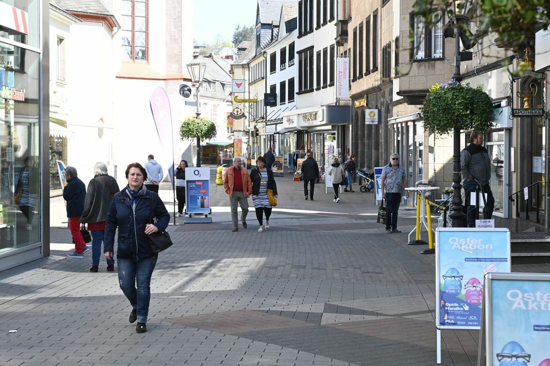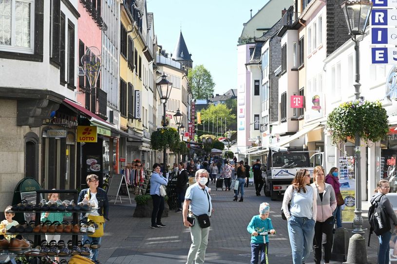 Die "kleineren" Geschäfte dürfen nur unter Auflagen wiedereröffnen. Die Kontaktbeschränkungen mit einem Mindestabstand von 1,5 Metern gelten weiterhin. In den Läden sind Abstandsmarkierungen und Einlass-Kontrollen an der Tagesordnung. So wie bei »Zeitgeist – Lebensart« in der Göbelstraße, wo Inhaberin Heike Berressem zum Abstand halten pinkfarbene Herzchen auf dem Boden platziert hat. Außerdem dürfen sich auf jeder Etage nur zwei Kunden gleichzeitig aufhalten. Nachbarin Monika Drexler (»Juwelier Geißler«) hatte ihre die Werkstatt – überwiegend für Uhr-Reparaturen – die ganze Zeit geöffnet. Jetzt kann sie aber in ihrem Ladenlokal, hinter Theken mit Plexiglas, Kunden begrüßen zu können. Karin Welsch (»Büro und Schreibwaren Welsch«) hatte vor der Öffnung »Bauchschmerzen«, da sie nicht wusste, wie sich die Leute verhalten werden. Aber bis auf eine Ausnahme waren alle Leute diszipliniert und hielten Abstand. Etwas verhalten war der Start bei »Lederwaren Meurer« in der Brückenstraße. Aber Inhaberin Ayla Rozera ist sicher, dass es »so langsam wieder anläuft«. Dass die Konsumenten ein Stück wiedergewonnene Freiheit genießen wollten, war am Montag in der Innenstadt deutlich zu spüren.